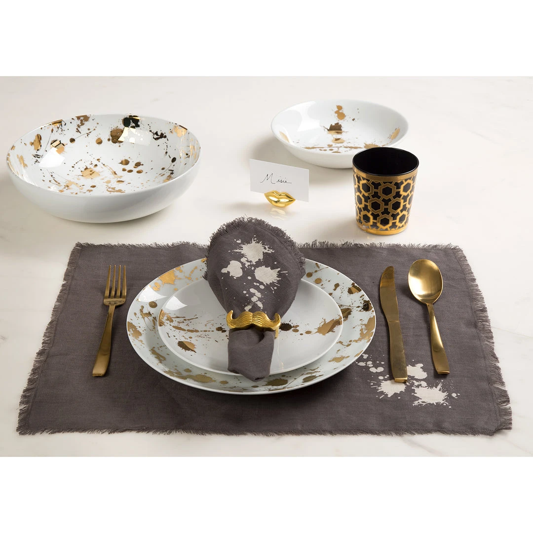 Chic and classique porcelain dinnerware in a generous scale and friendly coupe shape with a surprising splatter of solid gold. With its all-over splatter pattern, the dinner plate is like a sparkly neutral while the other pieces are embellished with a bold composition.