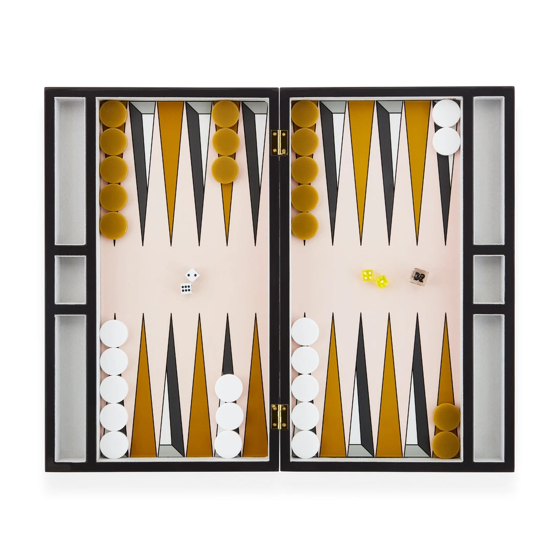 Featuring our moody Colosseum-inspired curves and colors and crafted in couture lacquer, our Arcade Backgammon Set is just the architectural oomph your game night needs. After vanquishing your foes, fold it closed for a chic cocktail table accent.
