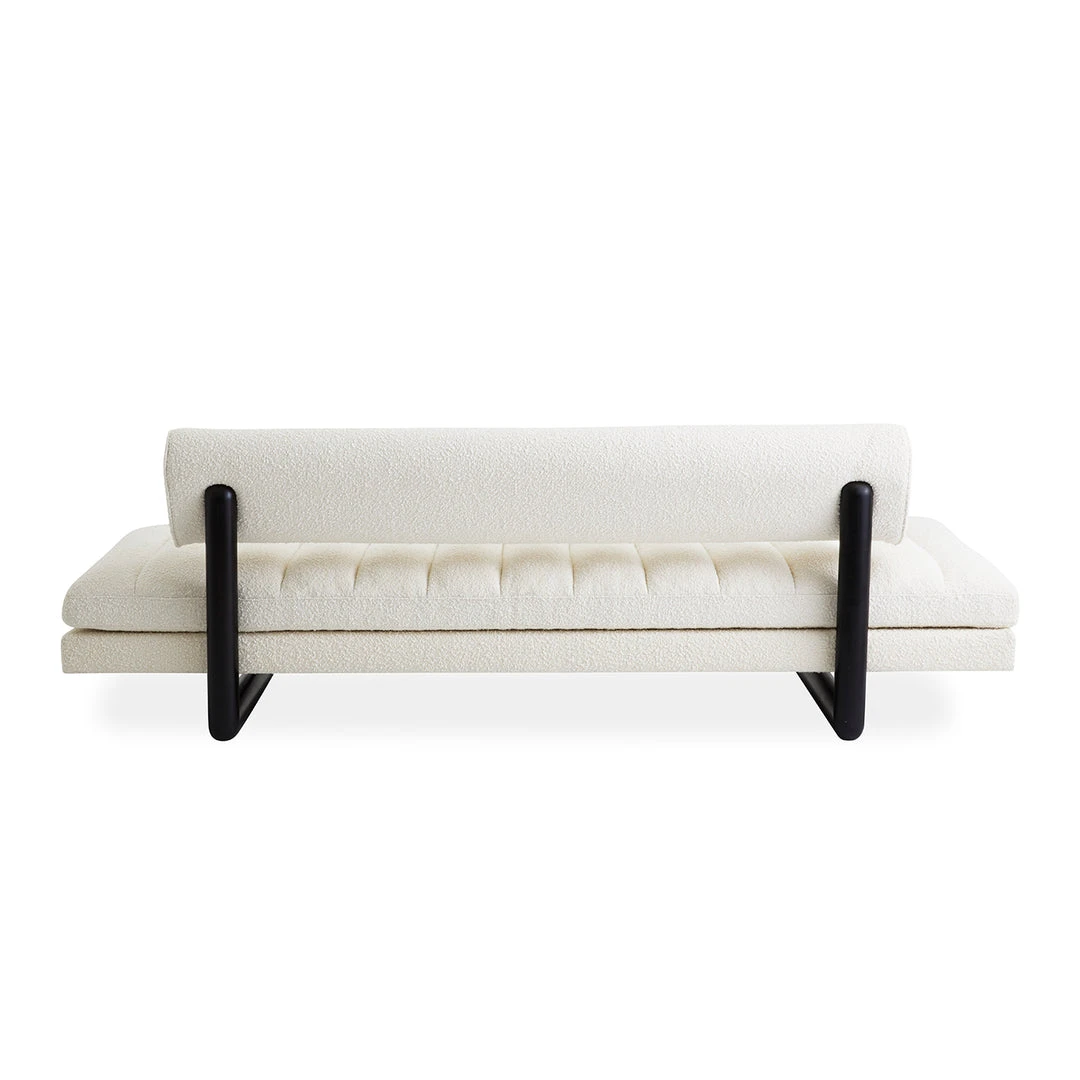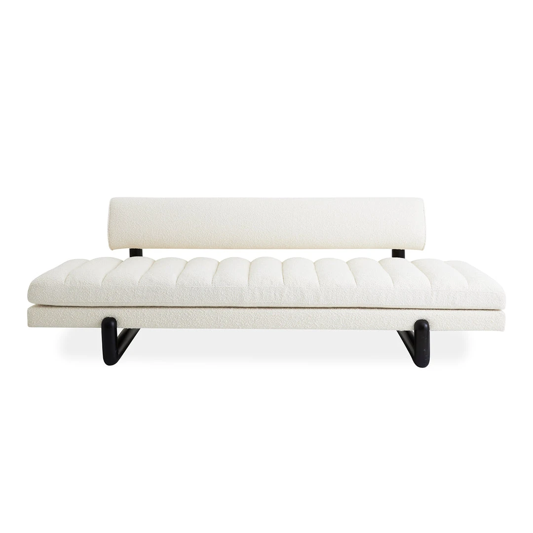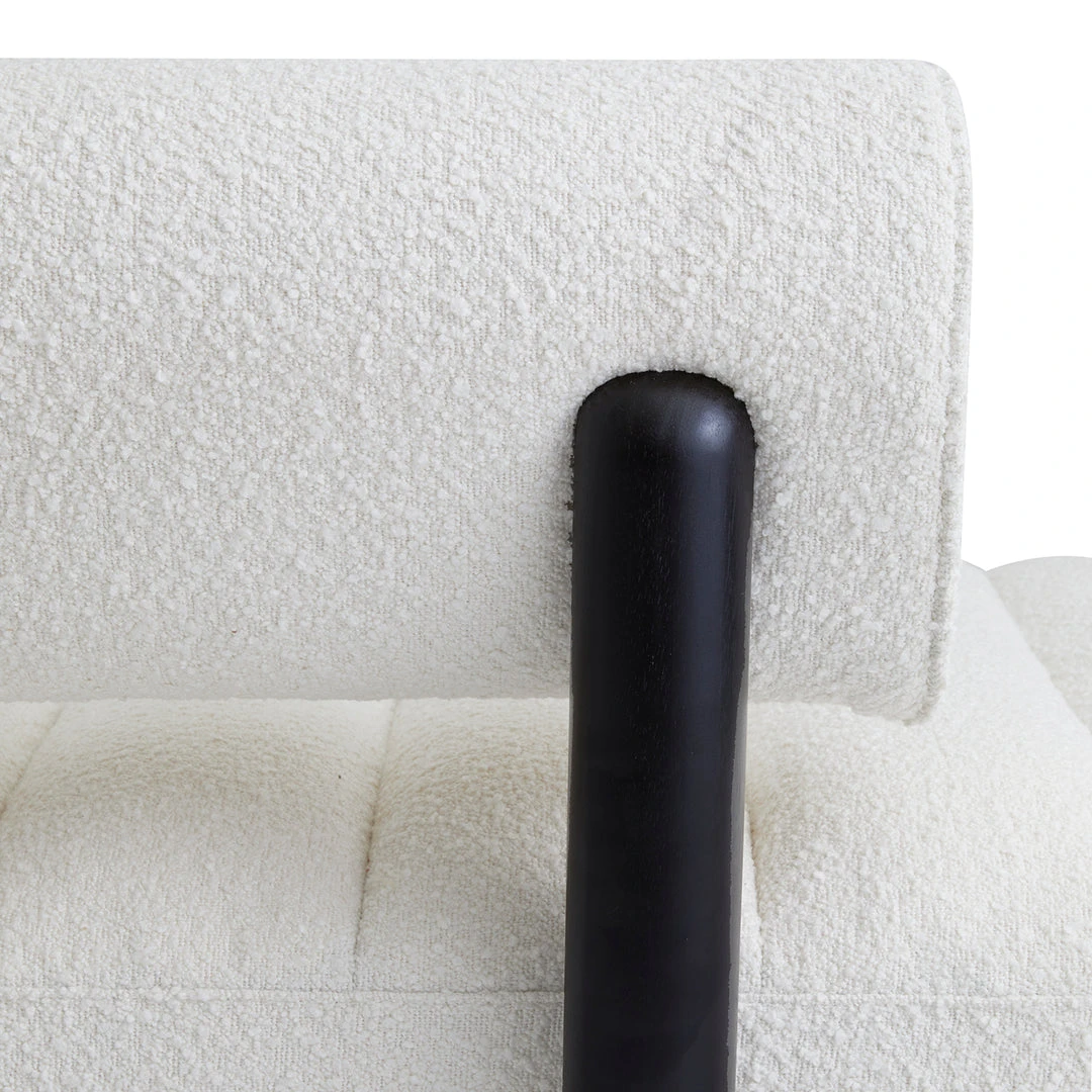 We’ve reimagined our angled Aspen Sofa as a shorter length slipper sofa. An exploration of the lozenge form, reflected by the tubular shape of the ebonized legs and floating back cushion. Channeled upholstery in ivory bouclé adds to the architectural intrigue.