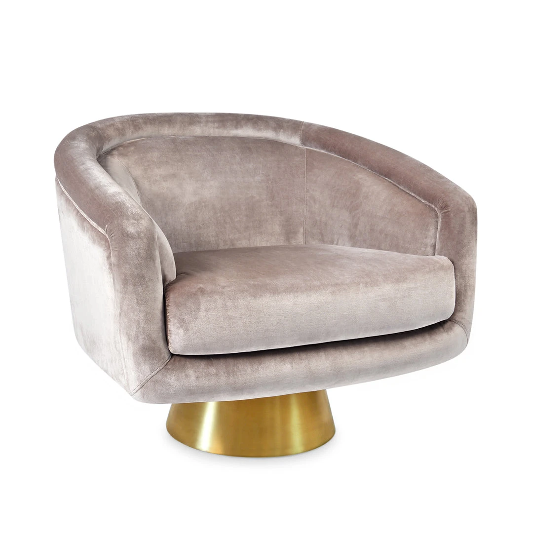 Think Halston, think Studio 54, think sybaritic style. But also think cozy, comfy swivel chair. Available in luxe Rialto Reef velvet atop a brushed stainless steel swivel base, or dreamy Como Champagne velvet atop a brushed brass swivel base.