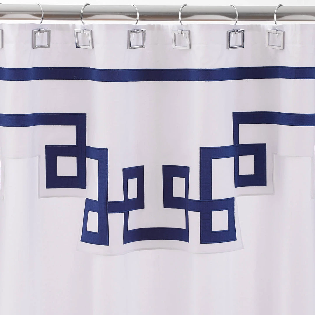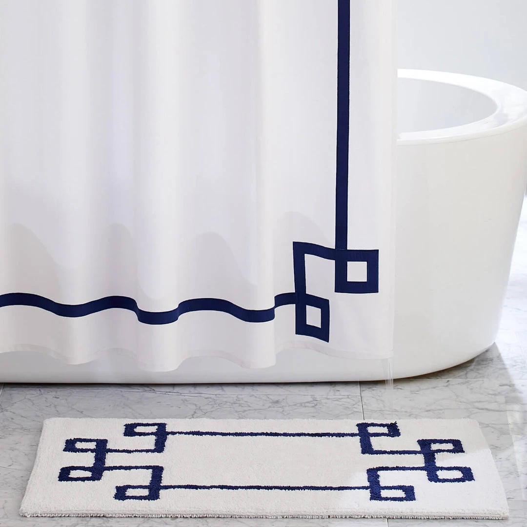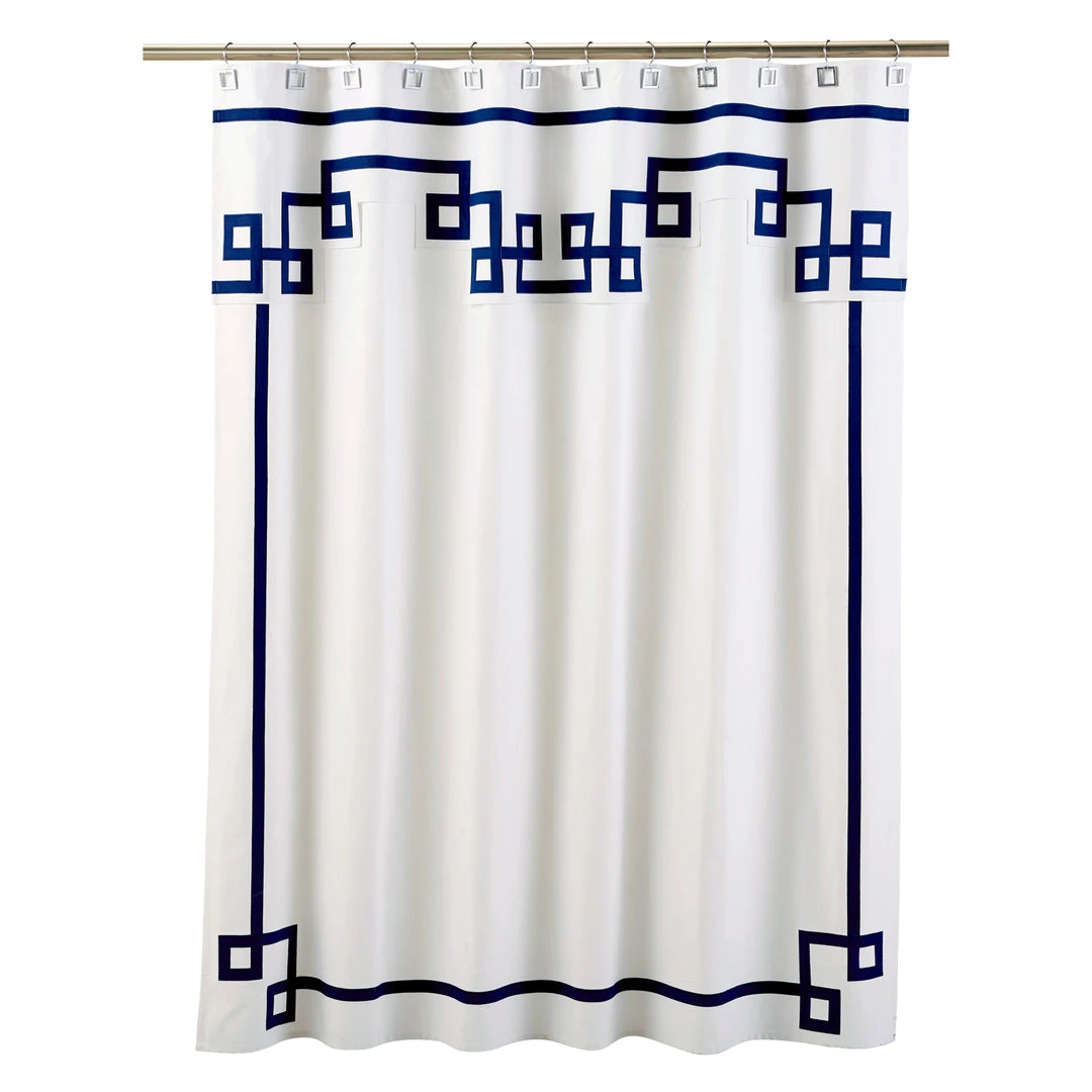 Bright white with a deep navy border, our Campaign Shower Curtain keeps it chic and classique. Tough, thick, and luxuriously soft to the touch, it’s also topped with an embroidered valance featuring our Greek Key design. Match with our Campaign Bath Rug and accessories collection for a coordinated look