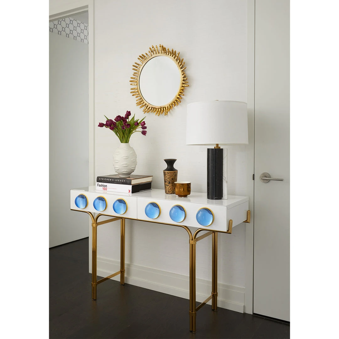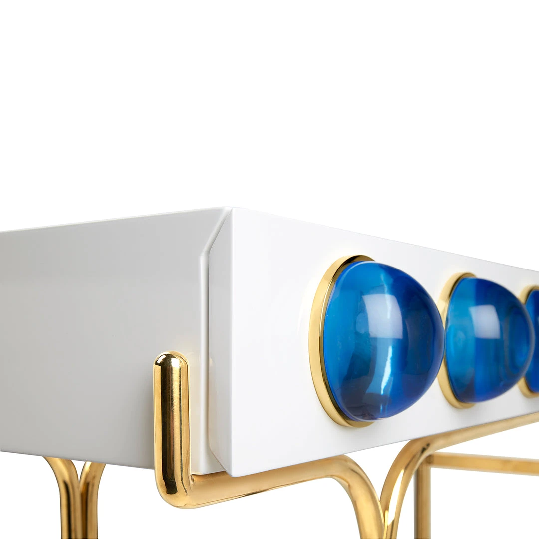 Float into our world of dreamy orbs and cabochons. Our Globo Console features a glossy white lacquer cabinet cradled by a sinuous brass framework and dotted with luminous solid blue acrylic cabochons set in polished brass. Sized to slip into smaller spaces, but also the kind of high-voltage glamour that stands out in a larger room.