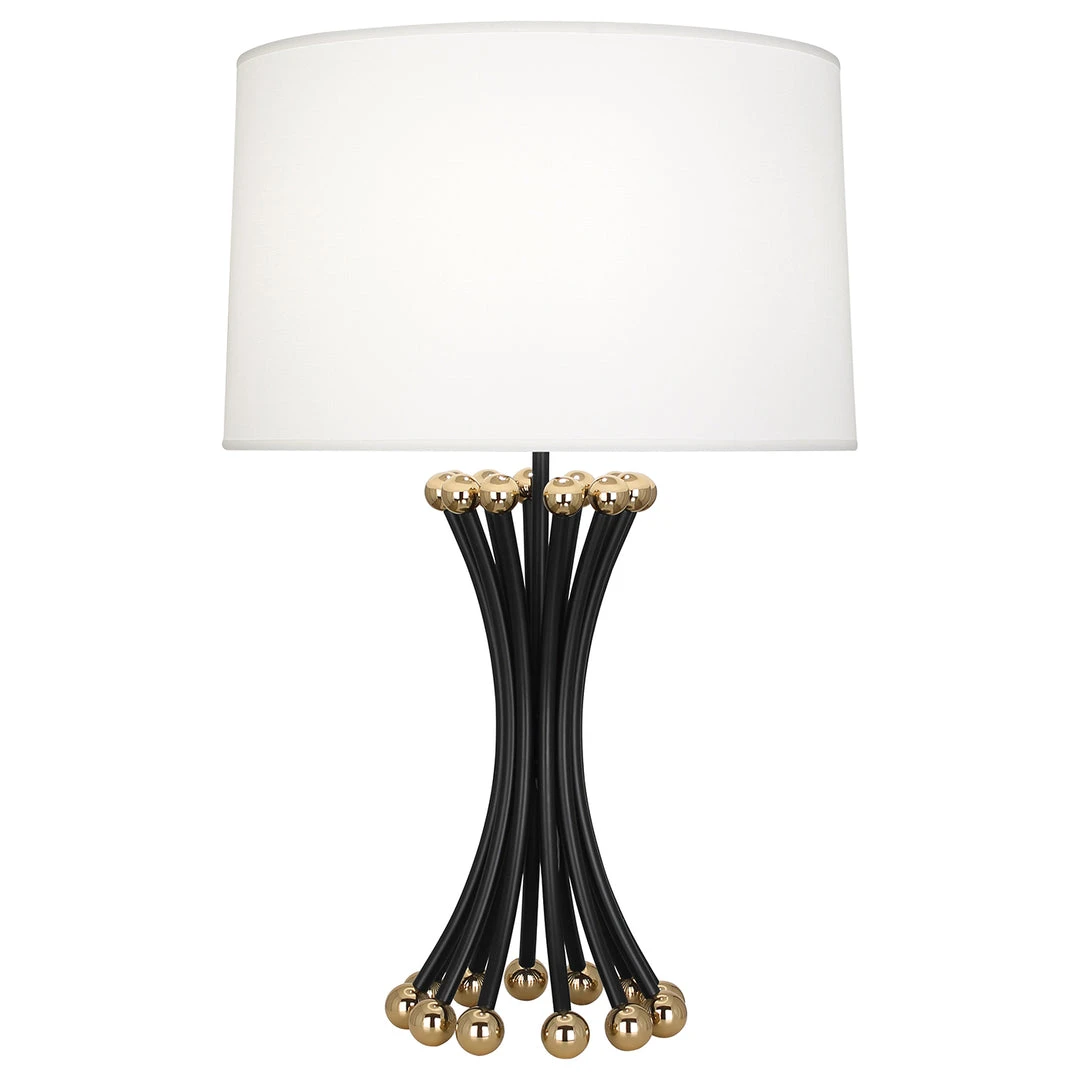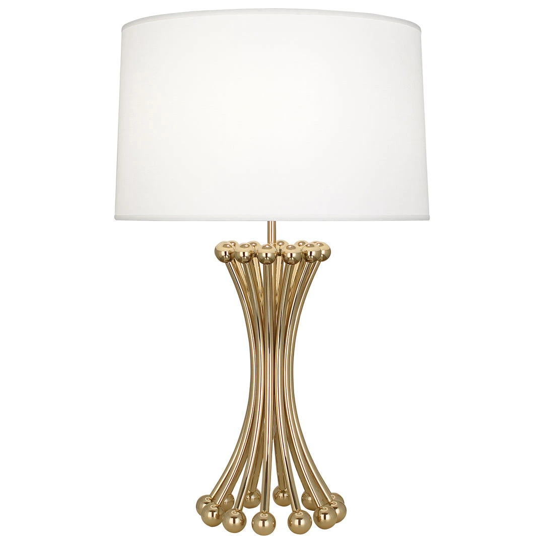 Inspired by Atomic Era mid-century lighting and treated to fabulous French flair, our Biarritz Table Lamp features a clutch of ball-capped metal rods shaped to form an hourglass silhouette. Available in polished brass or shiny nickel for a playful twinkle.