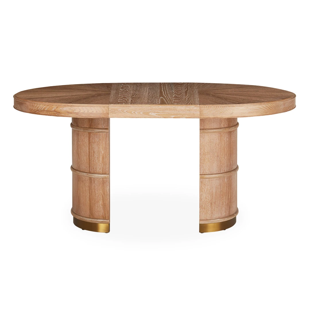 A hardworking wire-brushed and lightly limed solid oak tabletop with a radial pattern on a bamboo-inspired, brass-banded base which splits to accommodate a two-leaf expansion. Chic and timeless. Seats up to 10.