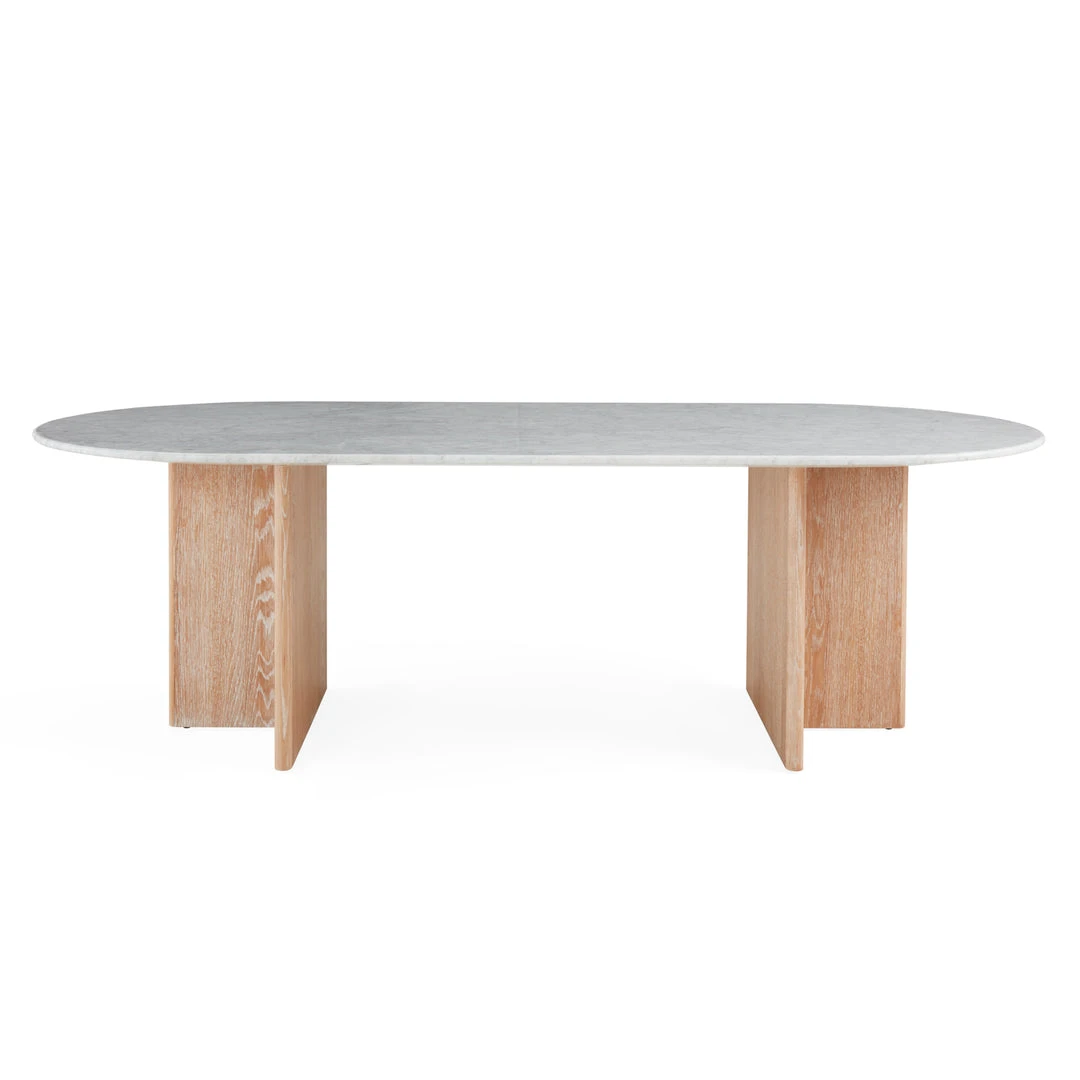 A capsule shaped white Carrara marble tabletop perched on T-shaped bases made from lightly limed solid oak. Featuring clean architectural lines and ultra luxe materials, our Brussels table evokes the spirit of the ultimate Brooklyn townhouse or Tribeca loft. Modern, timeless, and totally today. Seats 6 to 8.