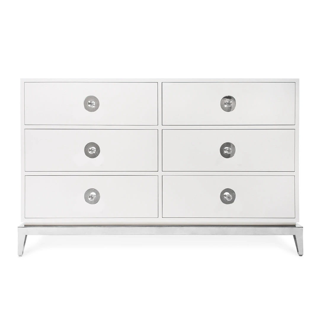Neo-Classical lines, a dash of Hollywood glamour, and a top note of Mod moxie: that’s our Channing Collection. Finished in glossy lacquer and featuring polished nickel accents with oversized acrylic knobs. Stash your stuff like a starlet in six generous drawers.