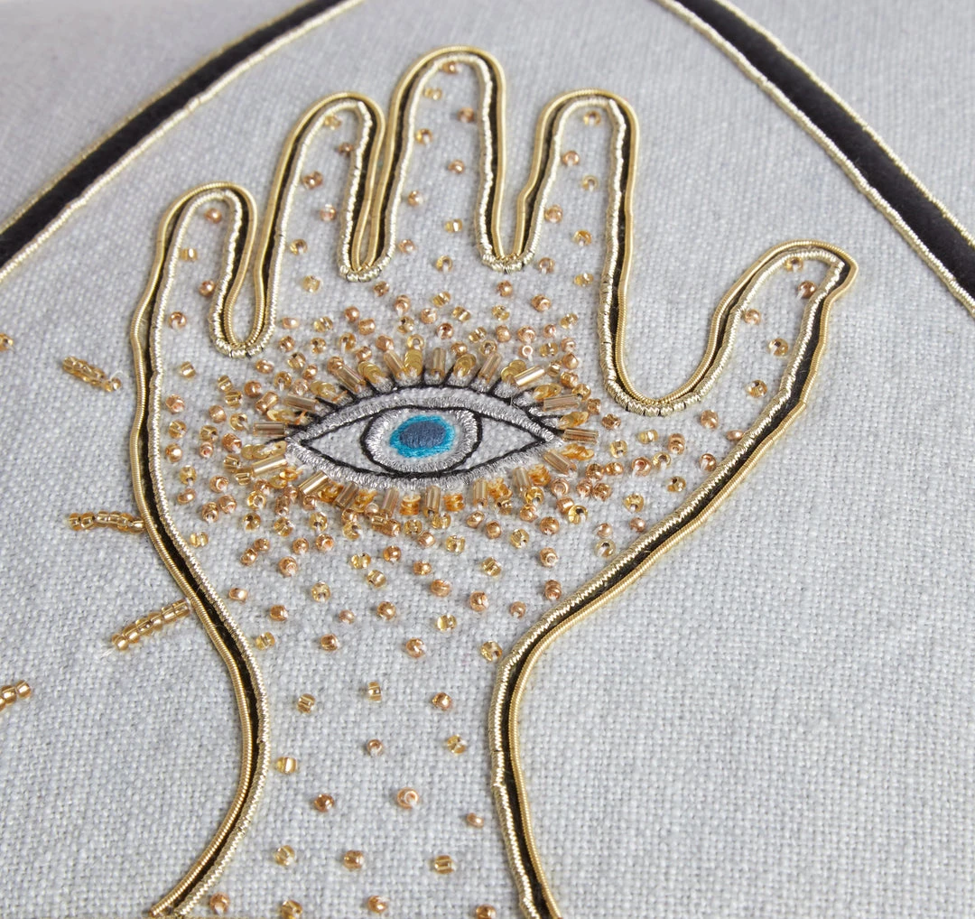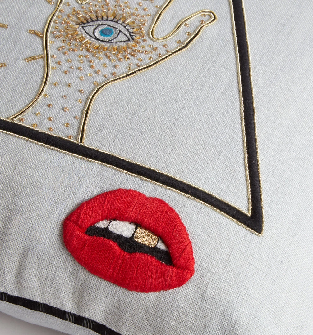 Evocative icons embroidered on light, sky blue linen. Hand beaded and adorned with sparkling gold threads, our Bijoux cushion are dreamy and provocative. Just the edgy glamour every eccentric cushionscape needs.