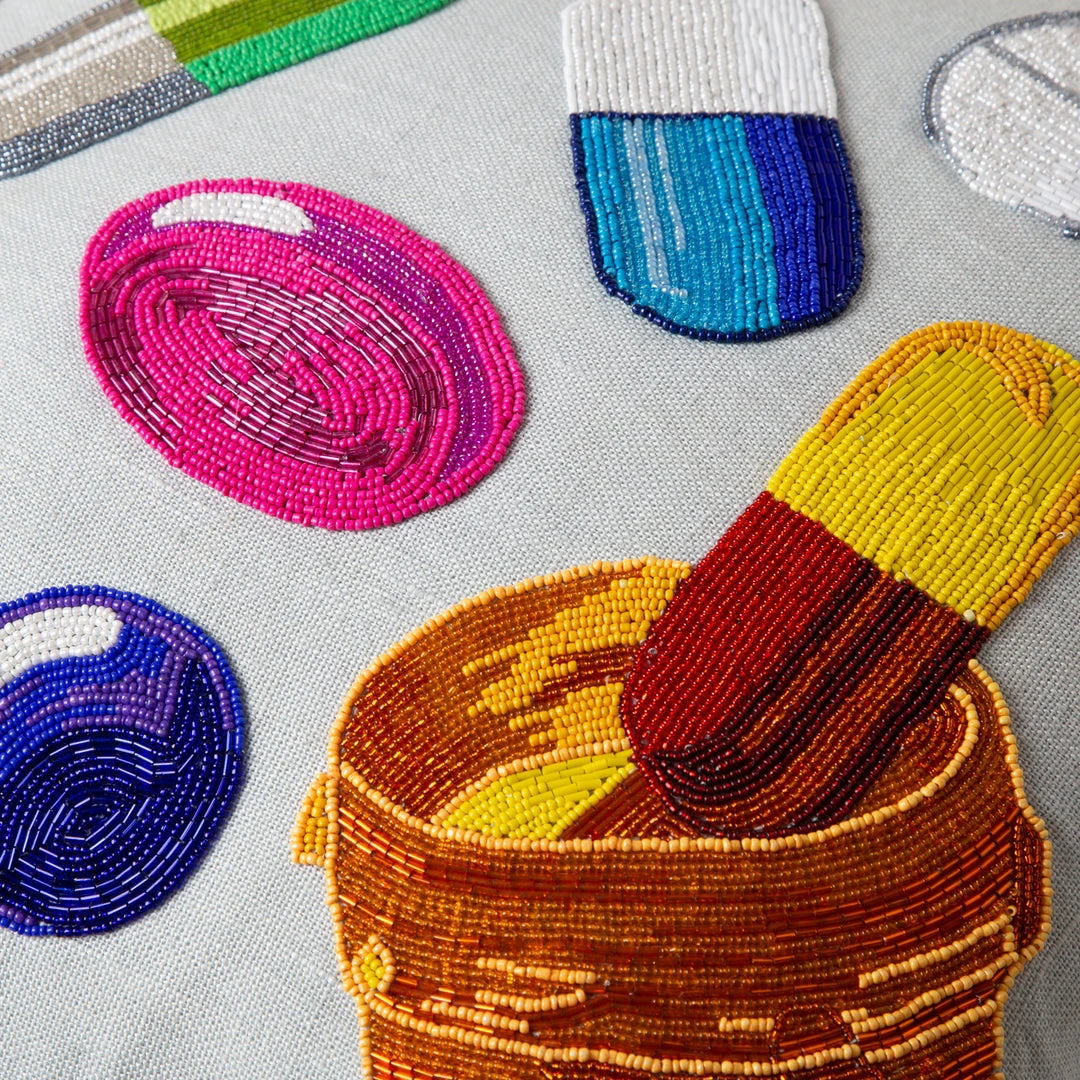 We collaborated with an artisanal workshop in India where a master beader imbued our clean graphic designs with craftsmanship and soul. Each artwork is hand-beaded on linen ground and takes nearly 100 hours to create. Beads of varying heights and patterns within patterns create a sense of depth and dimension. The result is part pop art, part textile triumph.