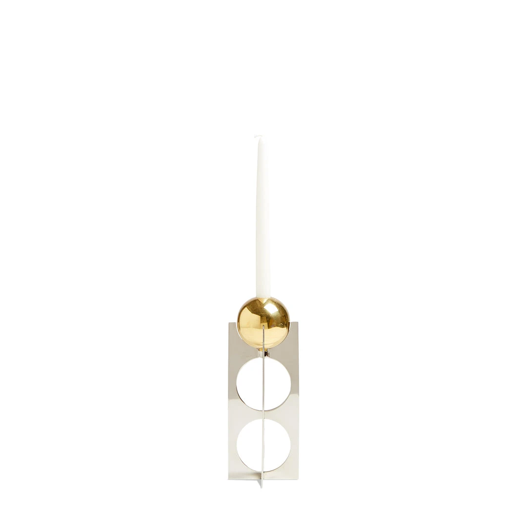 A steel x-base with mod circle cutouts supports a brass sphere candle holder. Mix and match heights to create an architectural skyline on your mantle or tablescape.