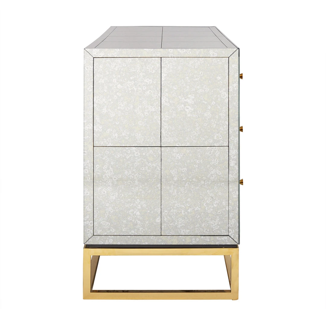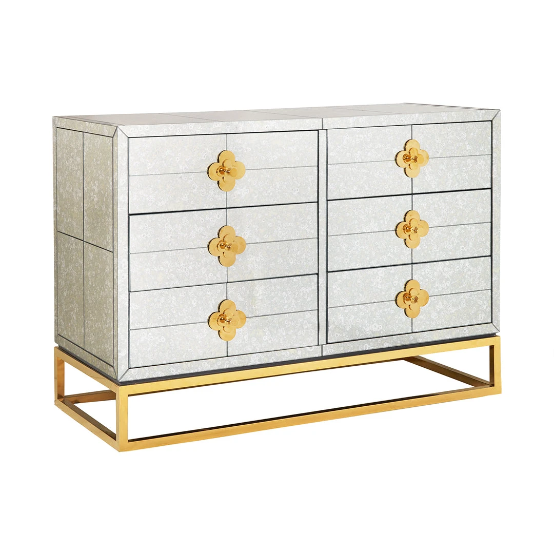 Minimalist forms meet Maximalist glamour. Our Delphine Six-Drawer Dresser features antiqued mirror with a polished brass base and jewel-like quatrefoil escutcheons. Each drawer opens to reveal a bright robin’s egg blue interior.