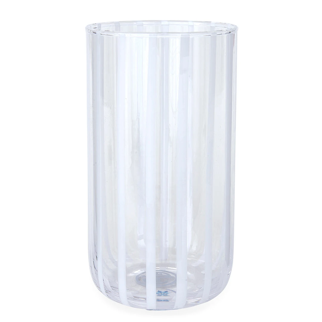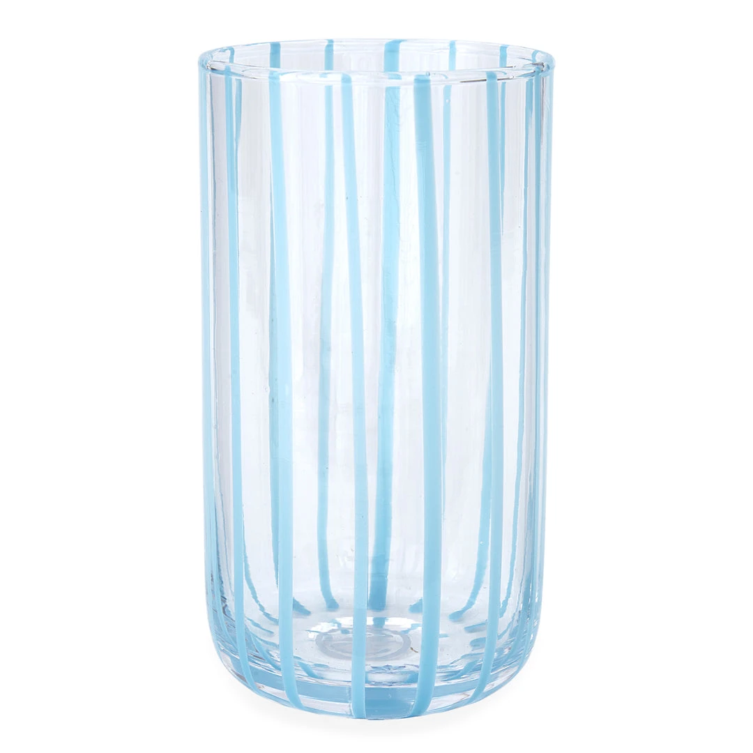 Give your next sips sesh a refresh. Our hand blown Cabana glassware features a ring of vertical stripes in either fresh white or pale blue—perfect for mixing and matching. Pair with our Cabana Glass Pitcher for coordinated cool.
