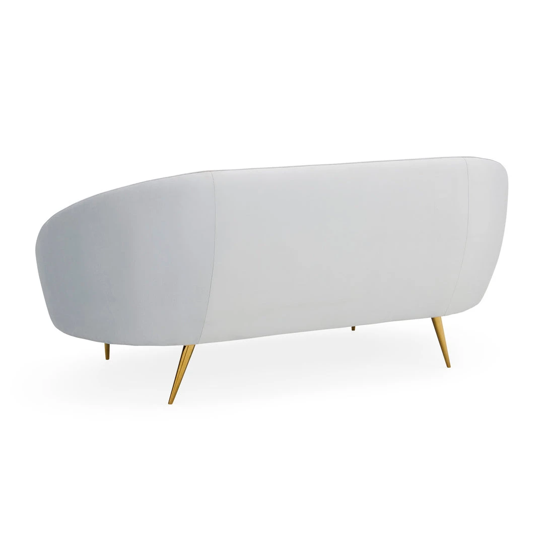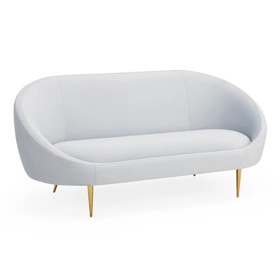 Low, loungey, and incredibly comfortable, our Ether sofas have a simple genesis story: Jonathan wanted to create a sofa that looks and feels like heaven. The lozenge-like silhouette is enveloping and inviting, while gleaming brass stiletto legs add lift and polish fit for a formal parlor. Striated icy velvet glows with dreamy hints of silver and blue for an ethereal yet edgy finish. Perfectly sized for your apartment or pied-Ã -terre, our Ether Apartment Sofa is also elegant enough for a chic sitting room.