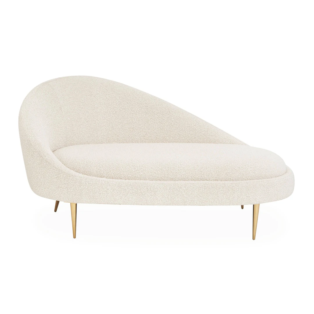 Low, loungey, and incredibly comfortable, our Ether collection has a simple genesis story: Jonathan wanted to create seating that looks and feels like heaven. Our Ether Chaise features a lozenge-like silhouette hugs at one end and slopes at the other, while gleaming brass stiletto legs add lift and polish fit for a formal parlor. Ethereal yet edgy, but also warm and inviting in our favorite nubby neutral—Olympus Oatmeal bouclé. A sculptural touch in your boudoir, or mirror a pair in your living room for serene symmetry. Available as a left- or right-arm chaise.