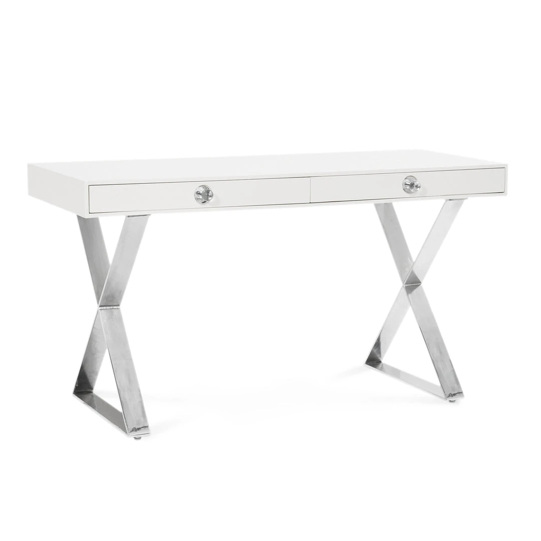 Crisscrossed polished legs and oversized acrylic knobs ooze cinematic glamour, making this an ideal vanity or the perfect spot to pen your next great romance. This is one sleek silhouette—fabulous for a small space.