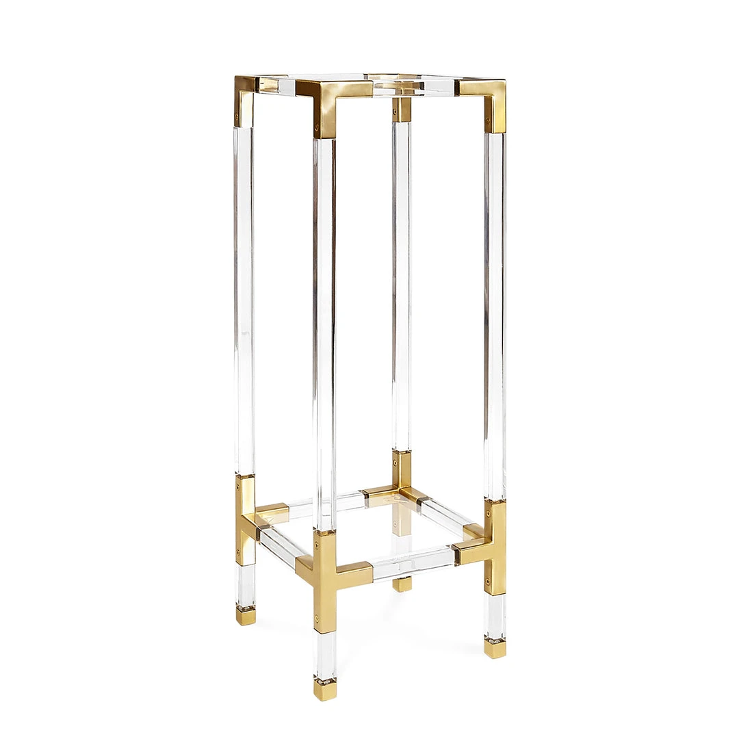 Made from luxe clear acrylic with brushed brass accents and fitted with a low glass shelf for baubles or books. Pedestals are every professional decorator’s secret weapon—the finishing touch you don’t realize you need. Perch a vase or bold bust on top, plunk in an unused corner or in front of a window, and watch the magic unfold. The perfect blend of simplicity and glamour, modern and traditional.