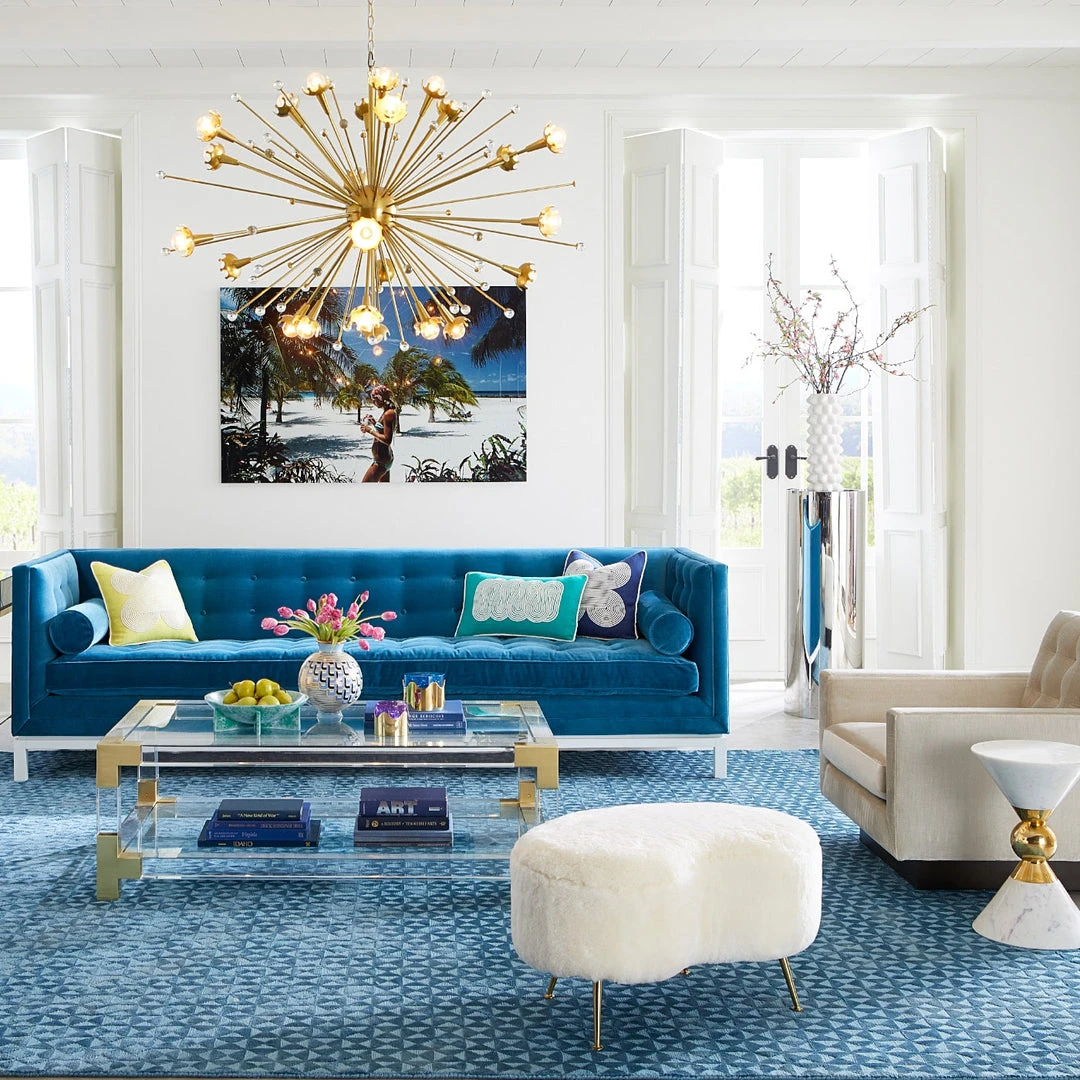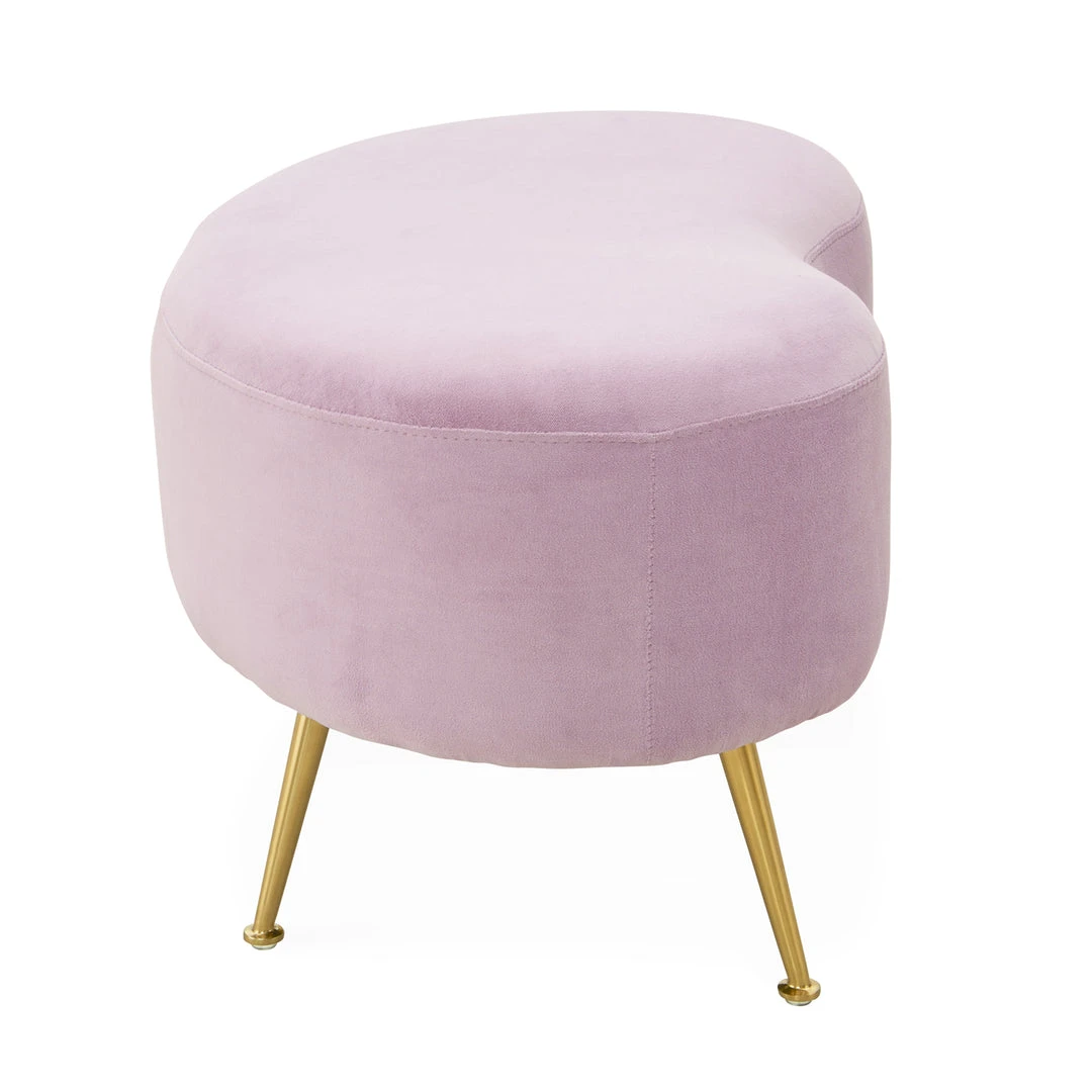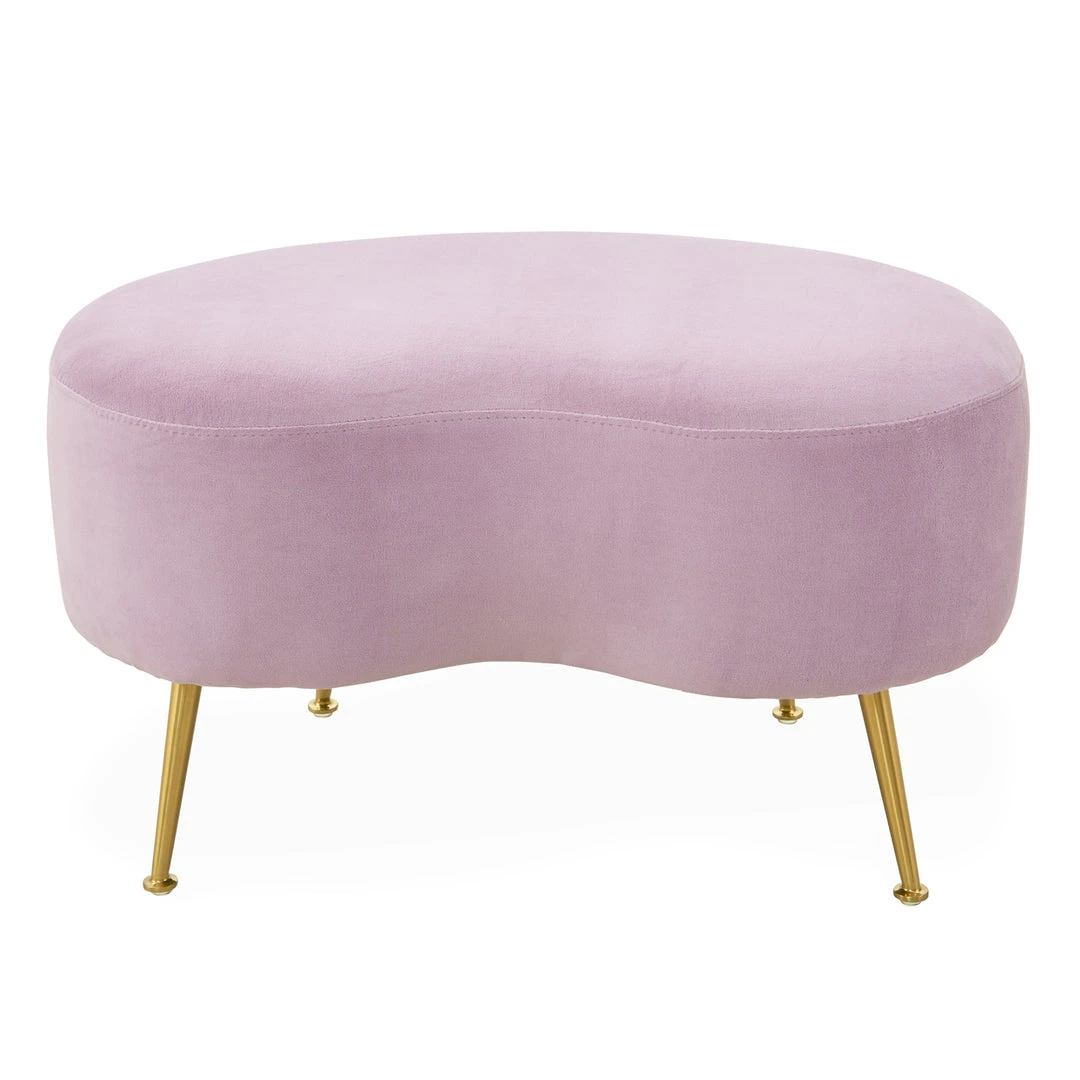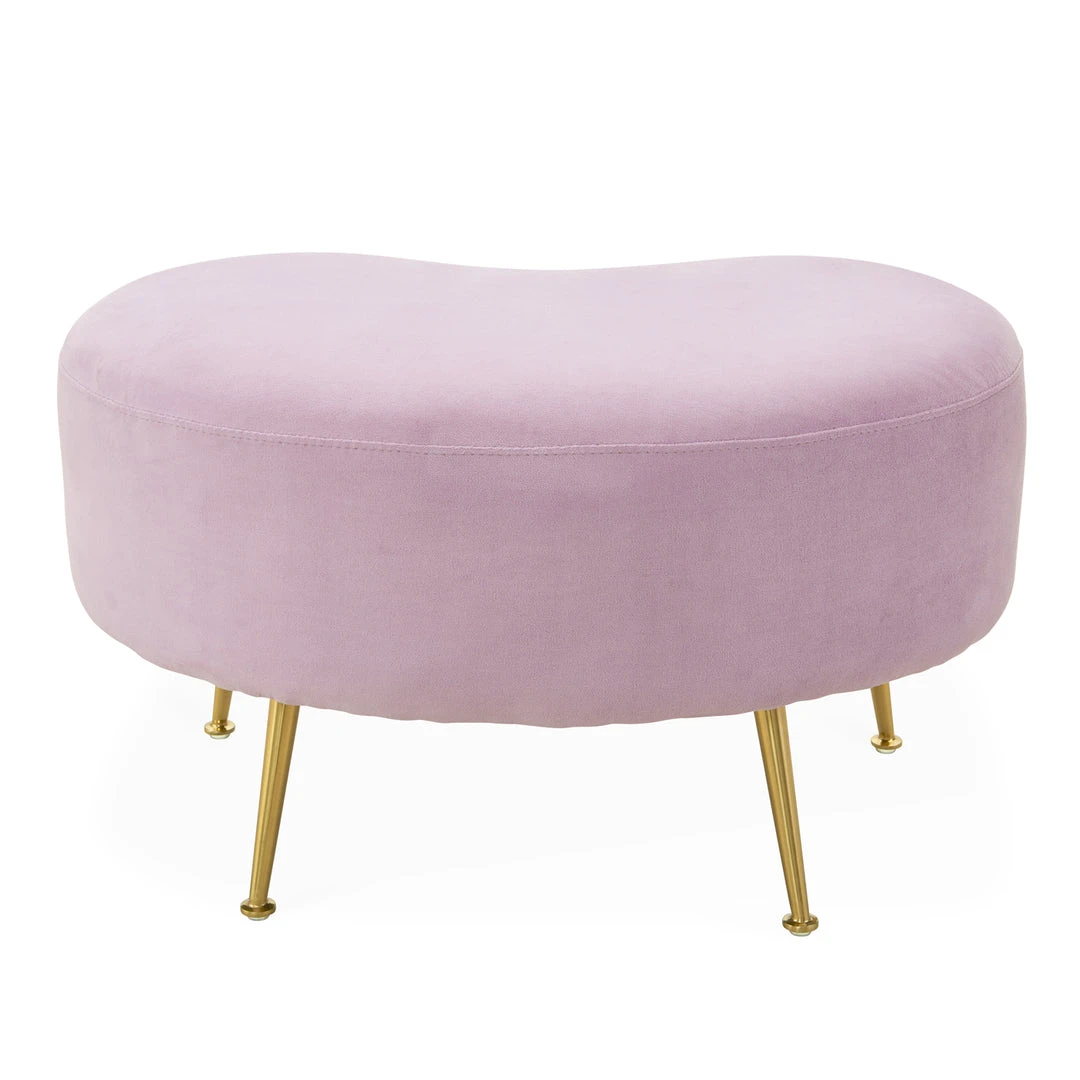 An elegant, fluid shape to give any room a swish of chic. The classic kidney-shaped silhouette gets an ultra-luxe makeover in shearling or a jewel-toned turn in lavender or turquoise velvet. Twinkly, angled brass legs take it to the next level. A curvaceous complement to any lounge chair or sofa.