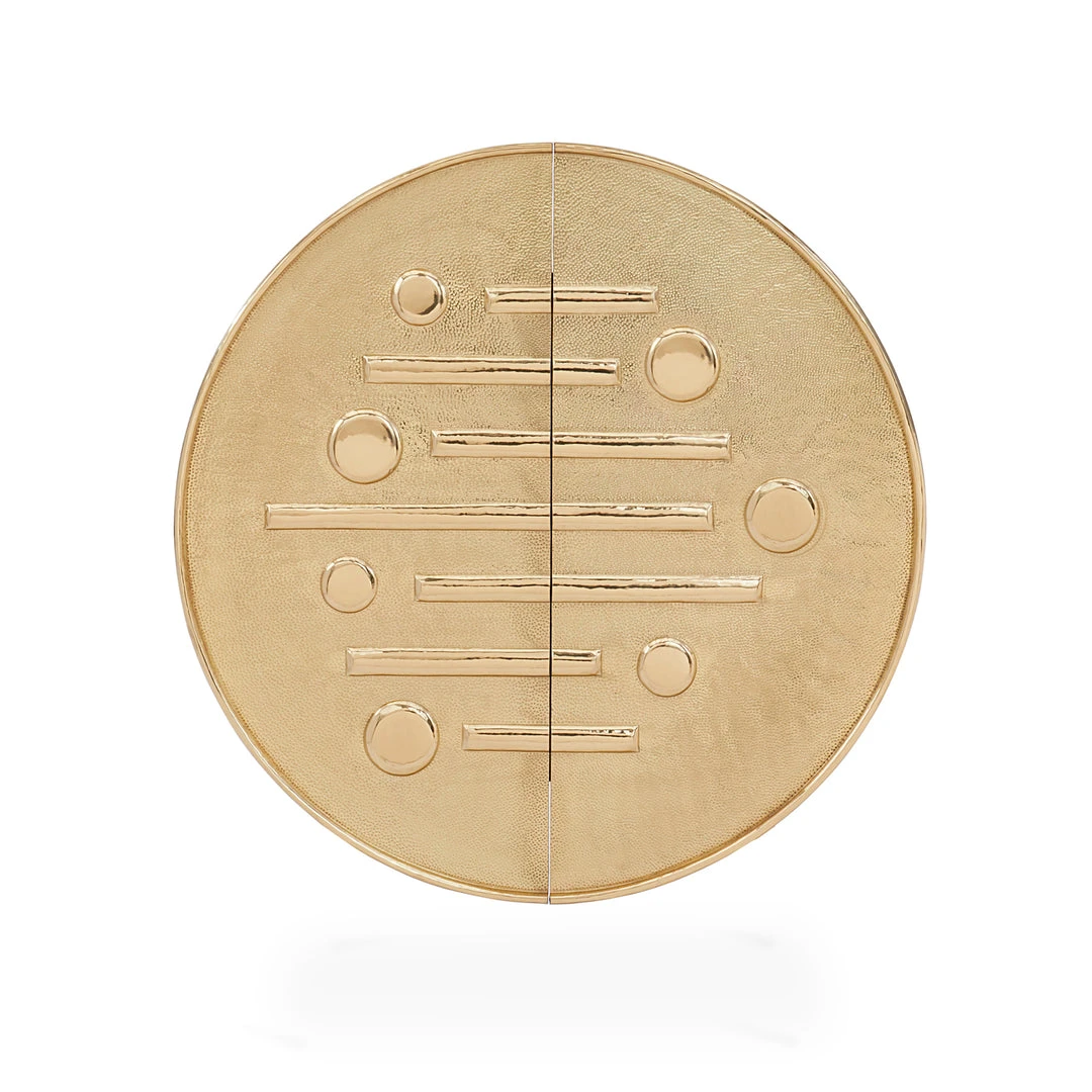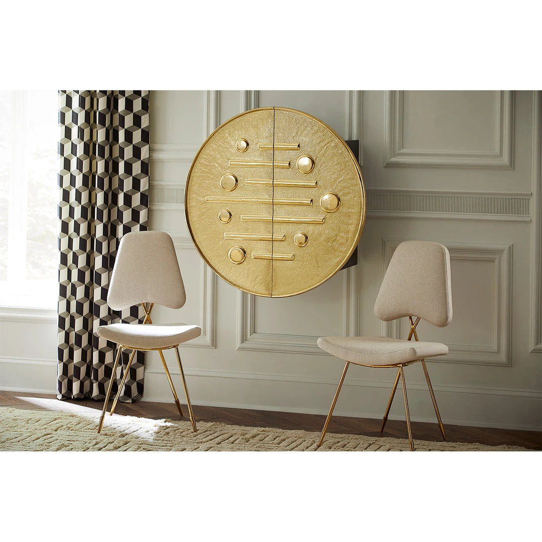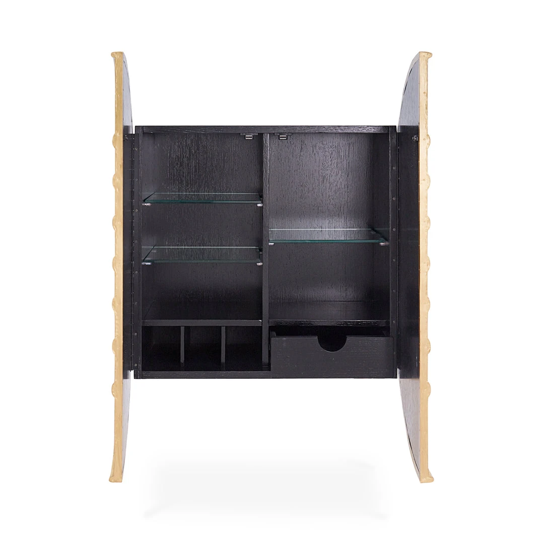 An ebonized and limed oak cabinet with doors featuring a relief texture originally sculpted in our Soho pottery studio—clad in a sheet of brass, then hand-hammered and polished to perfection. Designed to mount to the wall or stand on polished brass legs, our Reform Circle Bar is a must-have for couture cocktail hours. Interior features include adjustable shelves, a soft-close drawer and three organizational compartments.