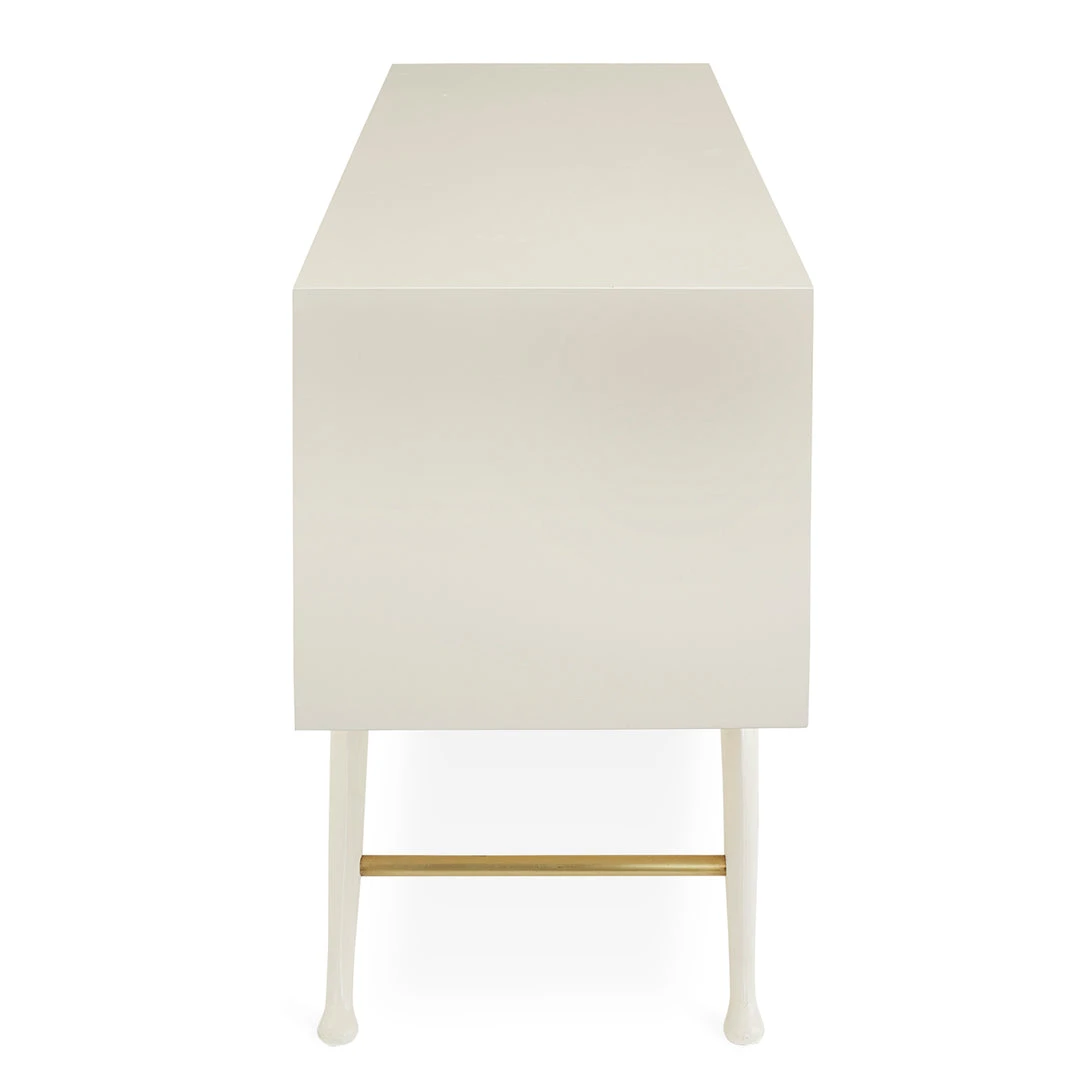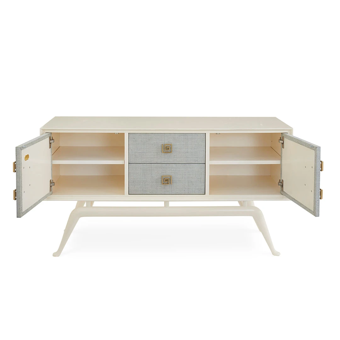 Our exotic Siam collection gets a fresh new feel. Featuring a solid mahogany case coated in ivory lacquer and faced with layers of natural raffia stained in an icy sky blue lacquer. Brass accents and Greek key hardware crank it up to 11.
