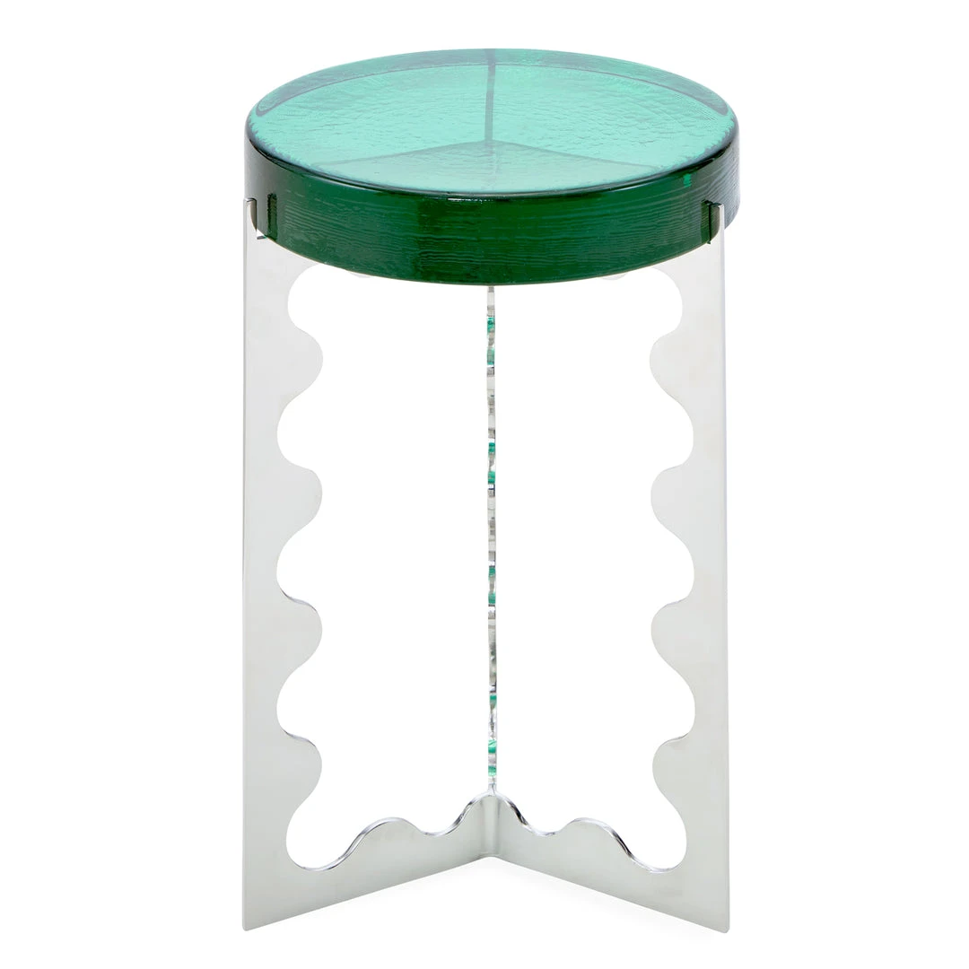 Luxe and luminous tables made from airy nickel bases topped with fabulously thick rounds of cold-cast glass, each featuring a unique pattern of trapped bubble inclusions. Two sizes available: tall with emerald glass, or short with cobalt glass.