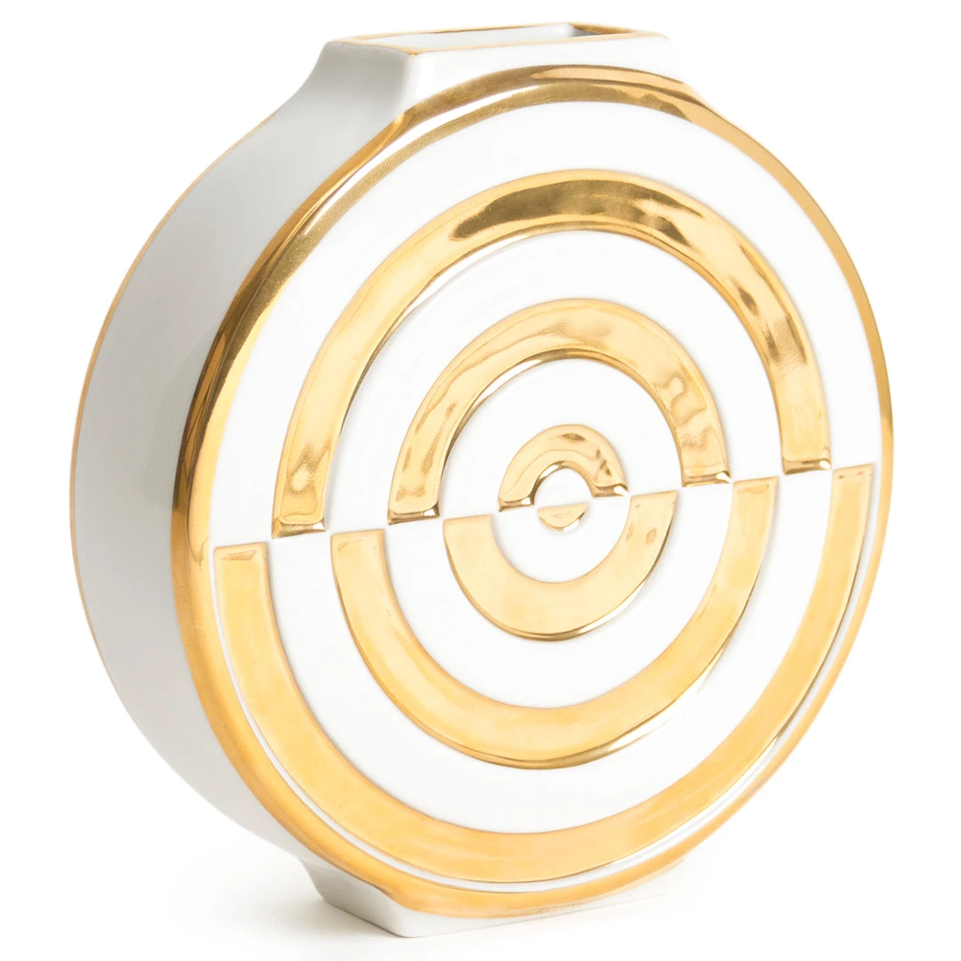 Modernist motif, socialite style. Our Deco-fied Futura Bullseye Vase features an Op Art inversion of a standard bullseye design rendered in glossy high-fired porcelain with real gold accents. Bring a modernist and mind-bending moment to your mantel or tablescape.