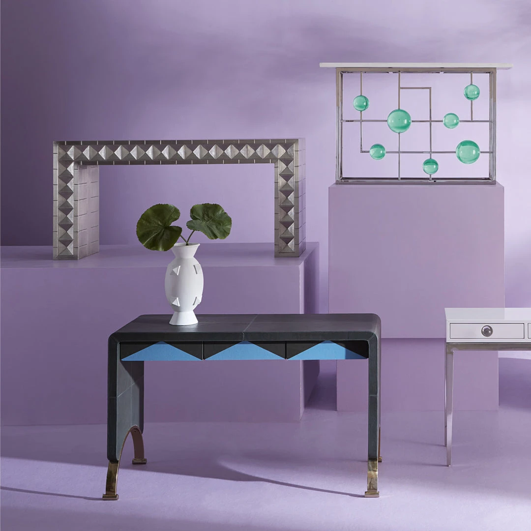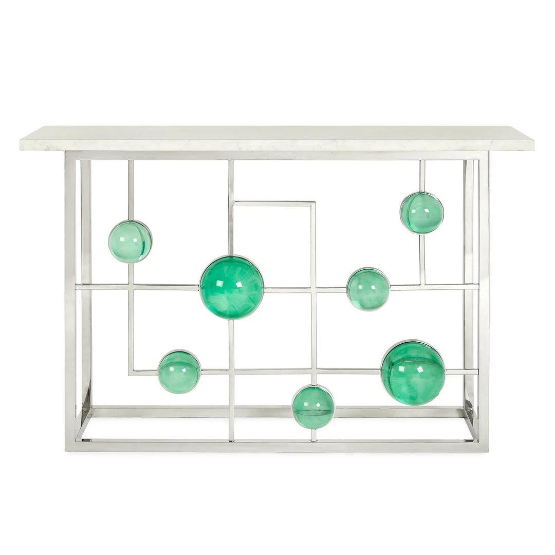 Float into our world of dreamy orbs and cabochons. Polished nickel fretwork cradles a constellation of emerald acrylic cabochons. Topped with a generous slab of white Carrara marble, our Globo Fretwork Console is petite but powerful, like a glamorous cocktail ring for your room. Fab in a foyer or sublime in pairs flanking an entryway.