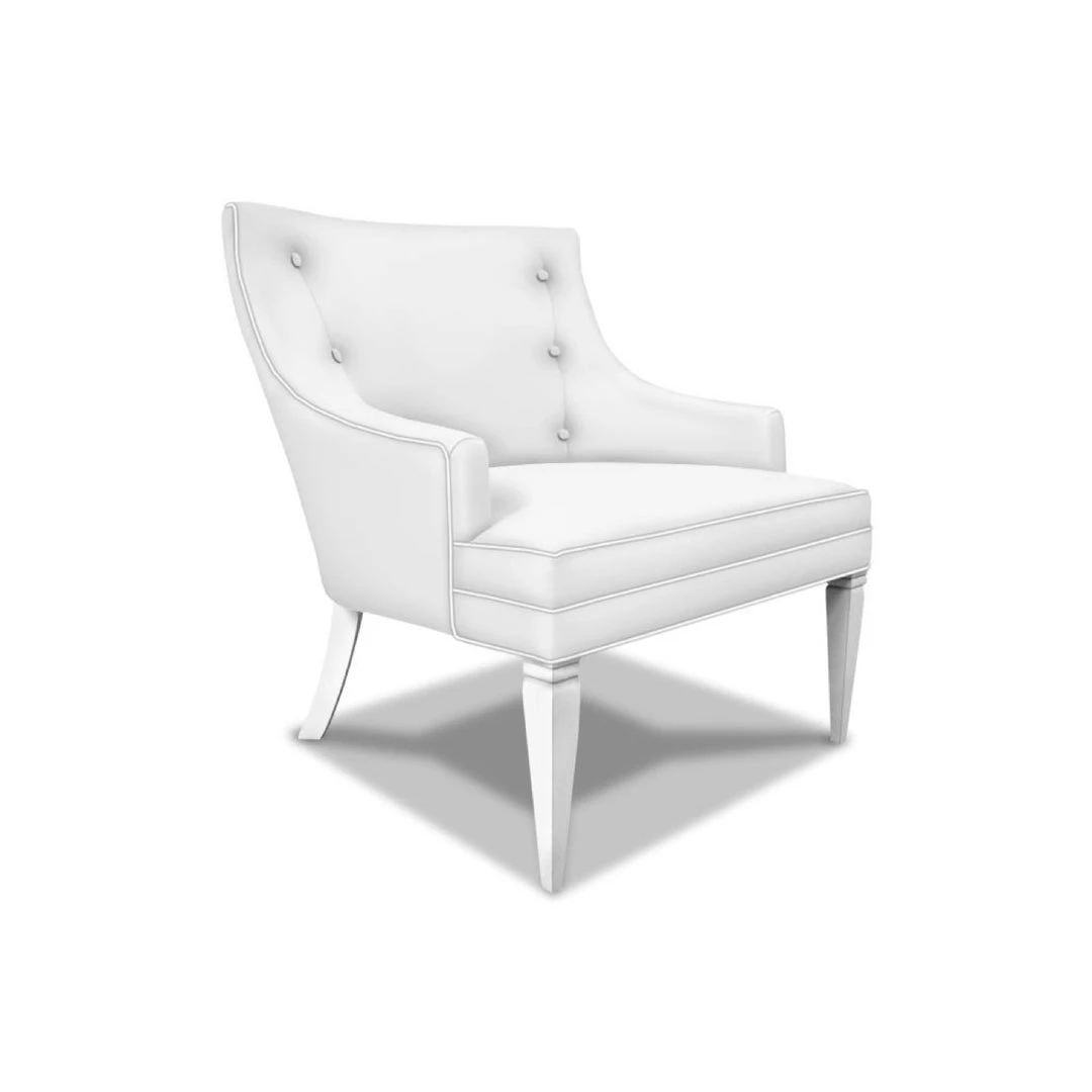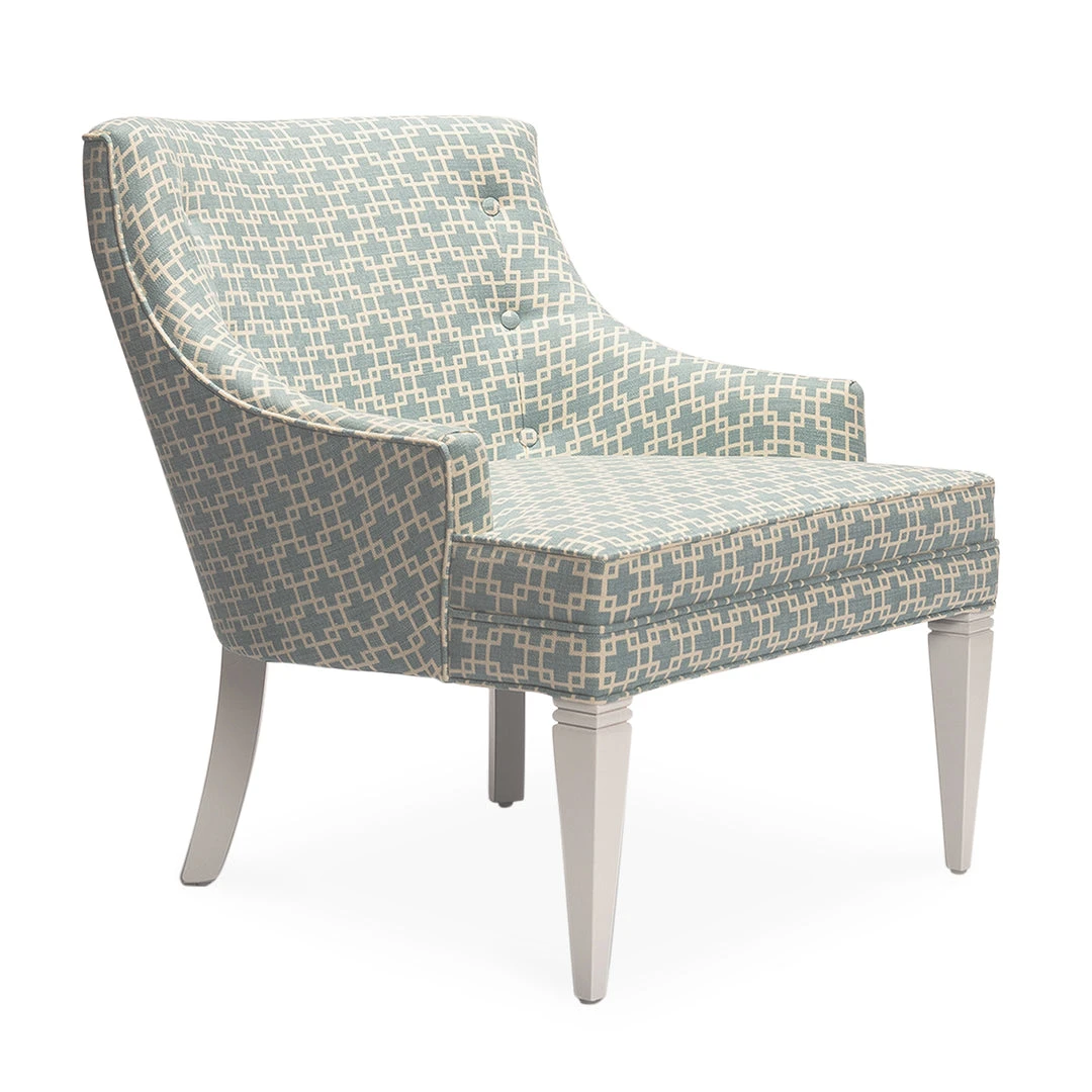 This chair’s ladylike proportions belie its desire to be center of attention. A graciously curved back with side button detailing slopes into the embrace of low-slung arms. Notched front legs heighten its appeal. Looks fab flanking a cocktail table or carving out a corner.