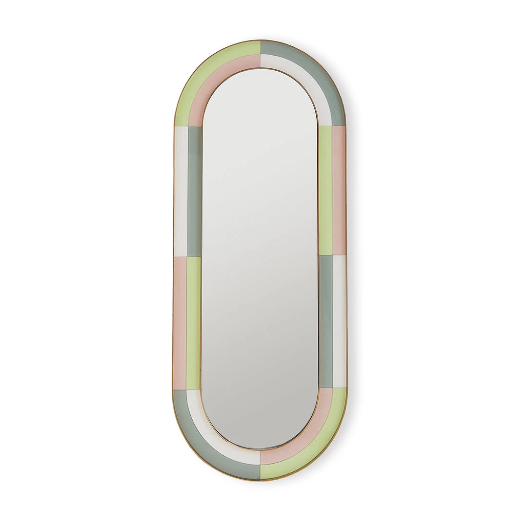 Finally, an ultra-chic full-length mirror. Featuring glass panes back-painted in early-morning inspired shades and recessed between two generous brass frames. The ultimate expression of Modern American Glamour, our Harlequin Capsule Mirror is colorful yet quiet, edgy yet soft, minimalist form with maximalist presence—this mirror hits all the right notes.