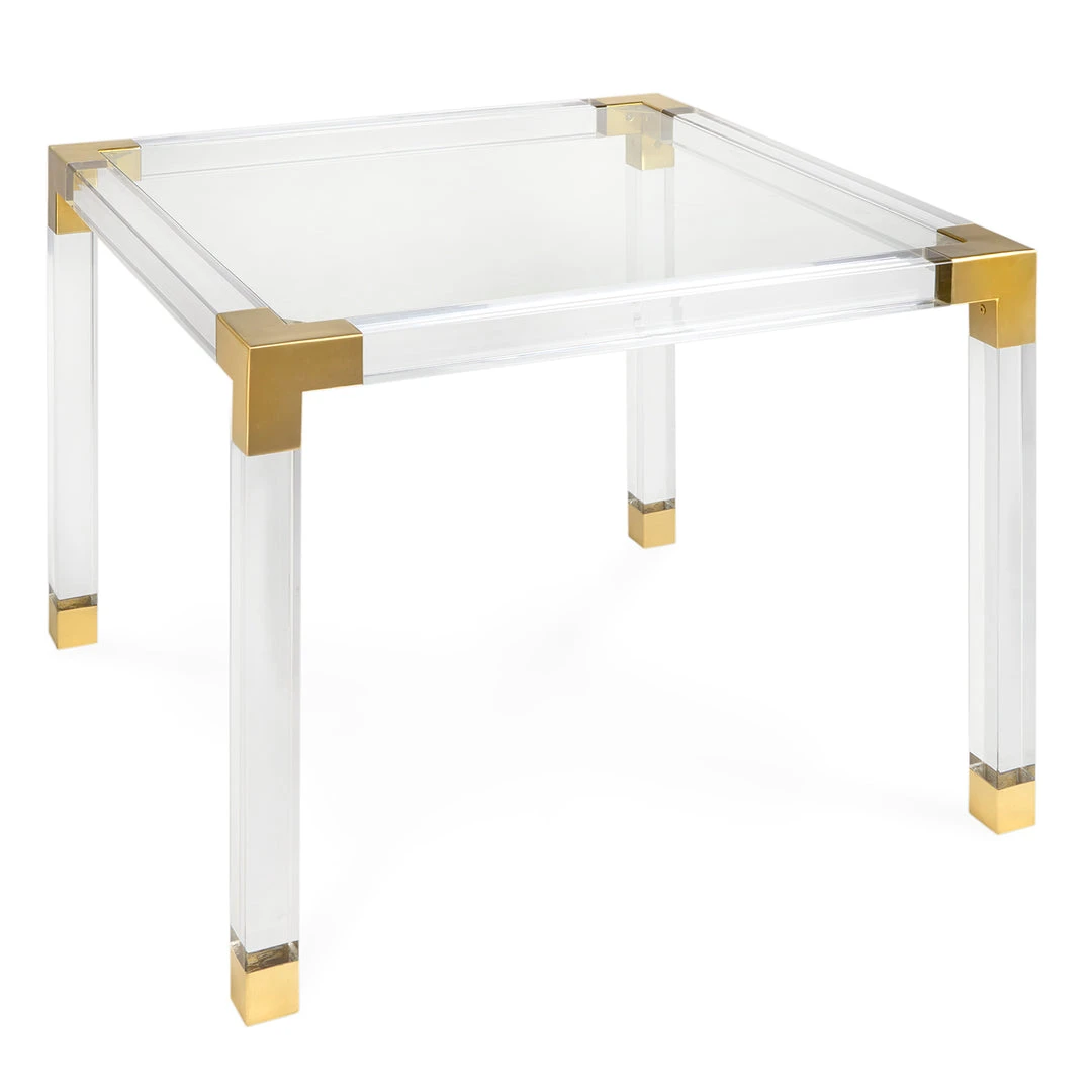 Luxe clear acrylic with brushed brass corners. Nothing finishes a room like a game table in a corner with a chandelier swagged over the top. The perfect blend of simplicity and glamour, modern and traditional, our Jacques Game Table also doubles as a petite dining table. Big presence, weightlessly transparent.