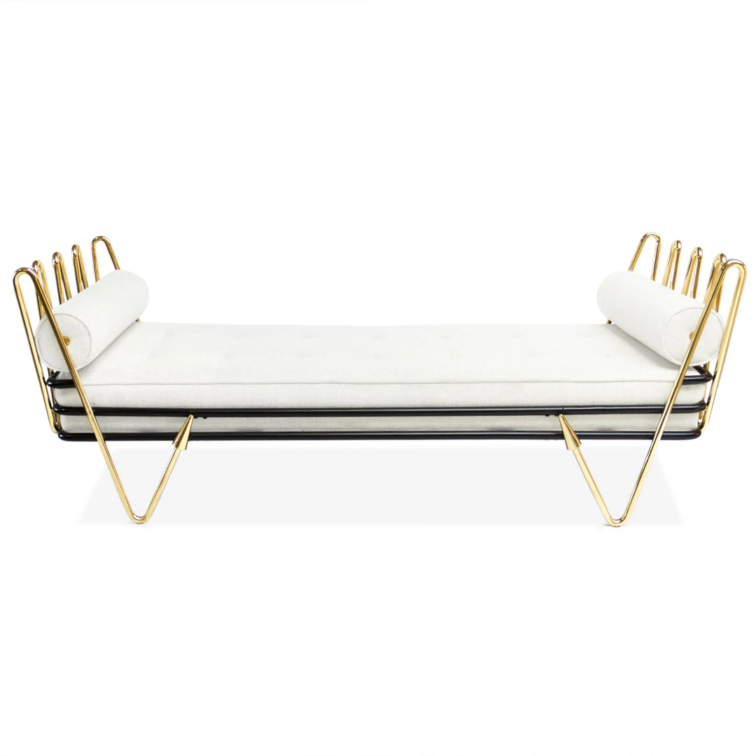 Sinuous, sculptural, surprising—our Maxime Daybed hits all the right notes. A gleaming brass frame cradles a gracious and soft cushion upholstered in a Palermo Dove basketweave. Arrow sabots and shiny brass buttons crank up the glamour. Daybeds are every decorator’s secret weapon—they add unexpected polish to a living room when placed opposite a sofa or bring a neglected corner to life. Our Maxime Daybed is perfect for an overnight guest, sassy socializing, or the occasional sneaky snooze.