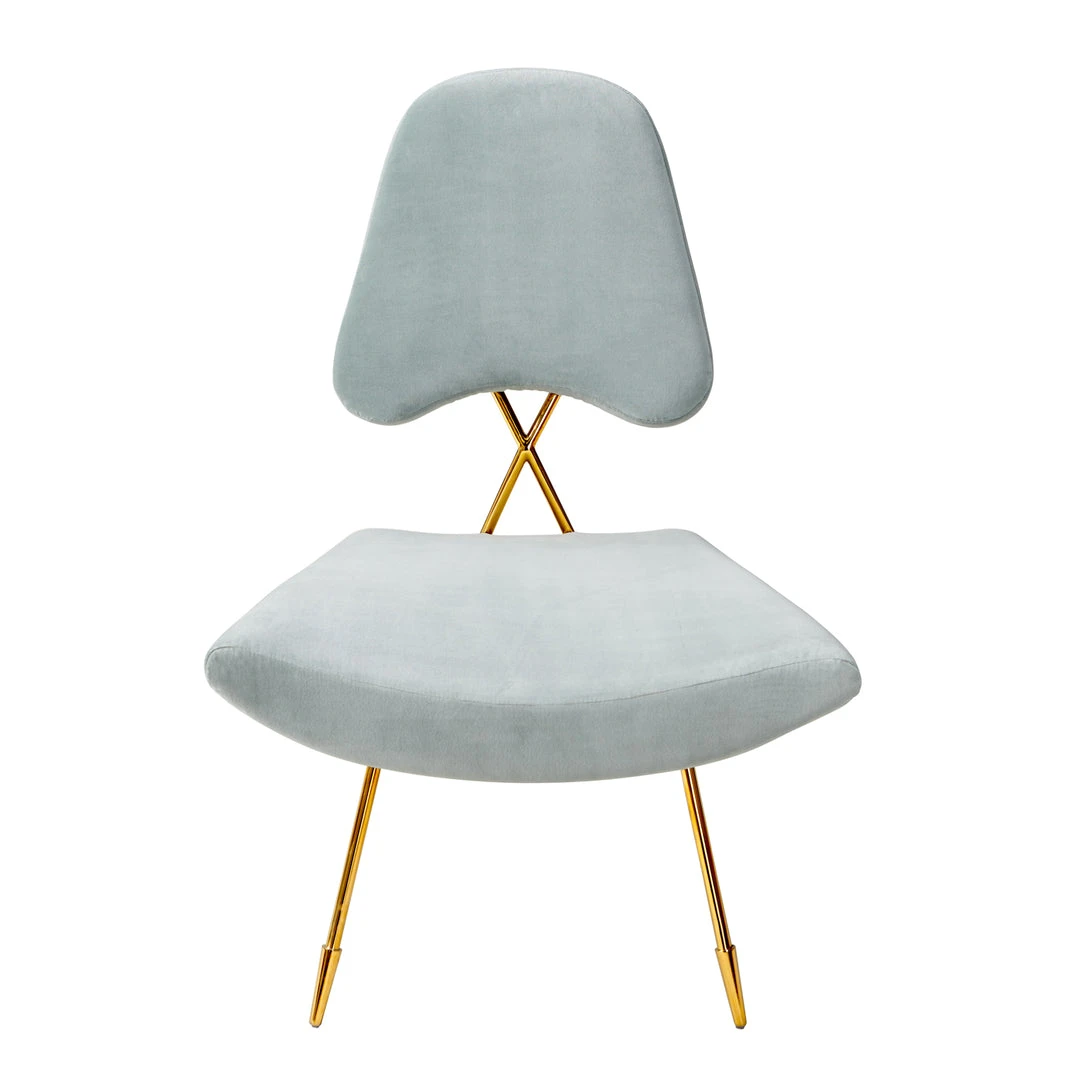 A gleaming brass frame with an intriguing crisscross back and our signature sabots cradles a softly curved seat and sculptural back. But don’t be fooled by the graceful frame—the Maxime Lounge Chair is very comfy. Available in chic and sumptuous shearling or light and luxe celadon velvet. Fab in a glamorous boudoir or living room.