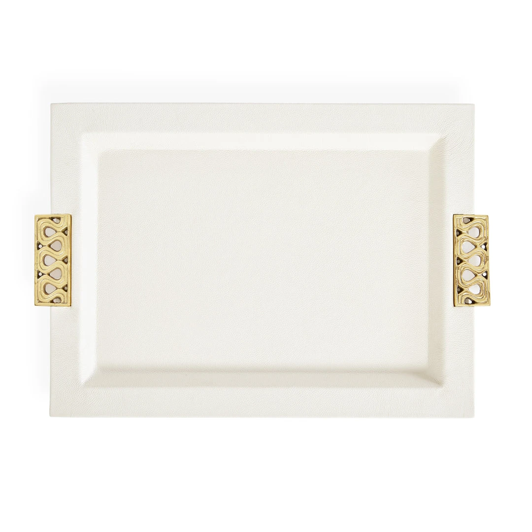 Wrapped in luxe ivory leather with hand polished brass handles featuring our signature mod concentric loop pattern. A heavenly hue, a dash of glamour, fabulously functional—our Milano tray goes with everything. The perfect accessory for an ottoman or cocktail table, and looks just as chic on your console.
