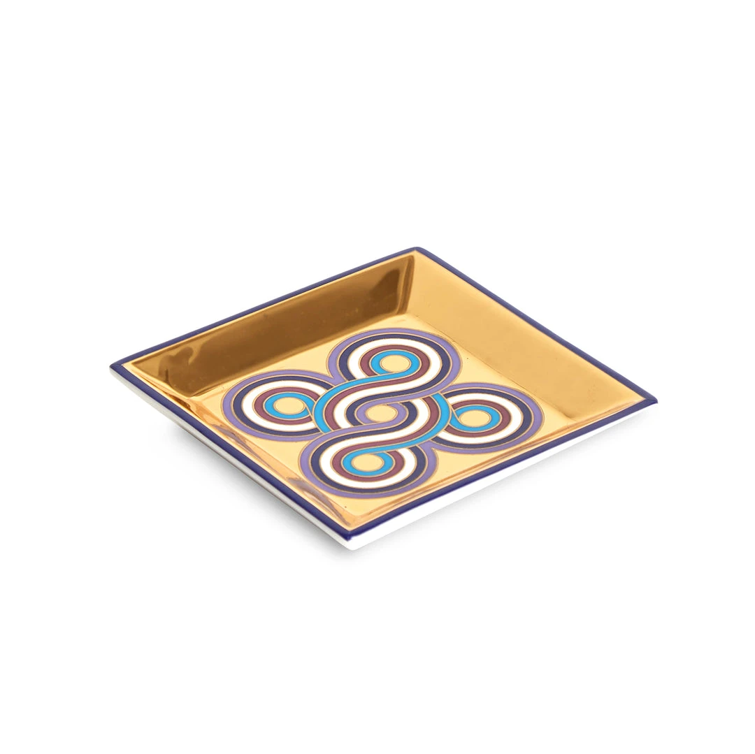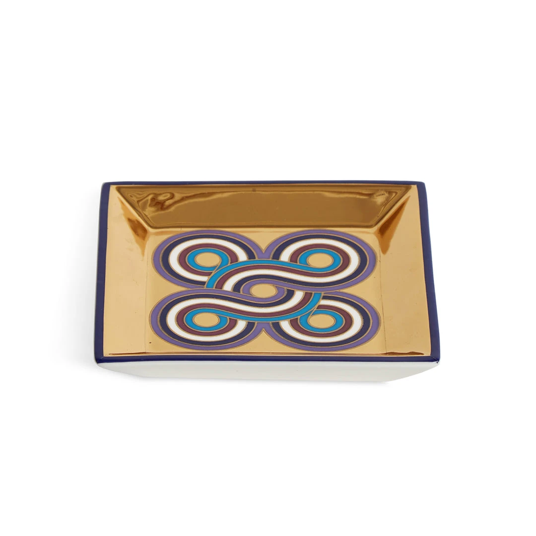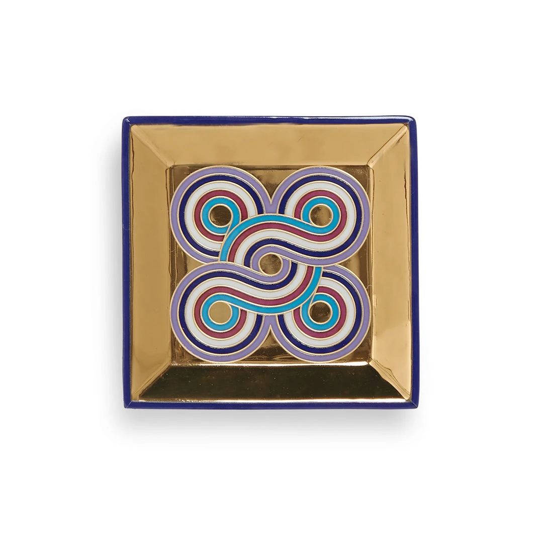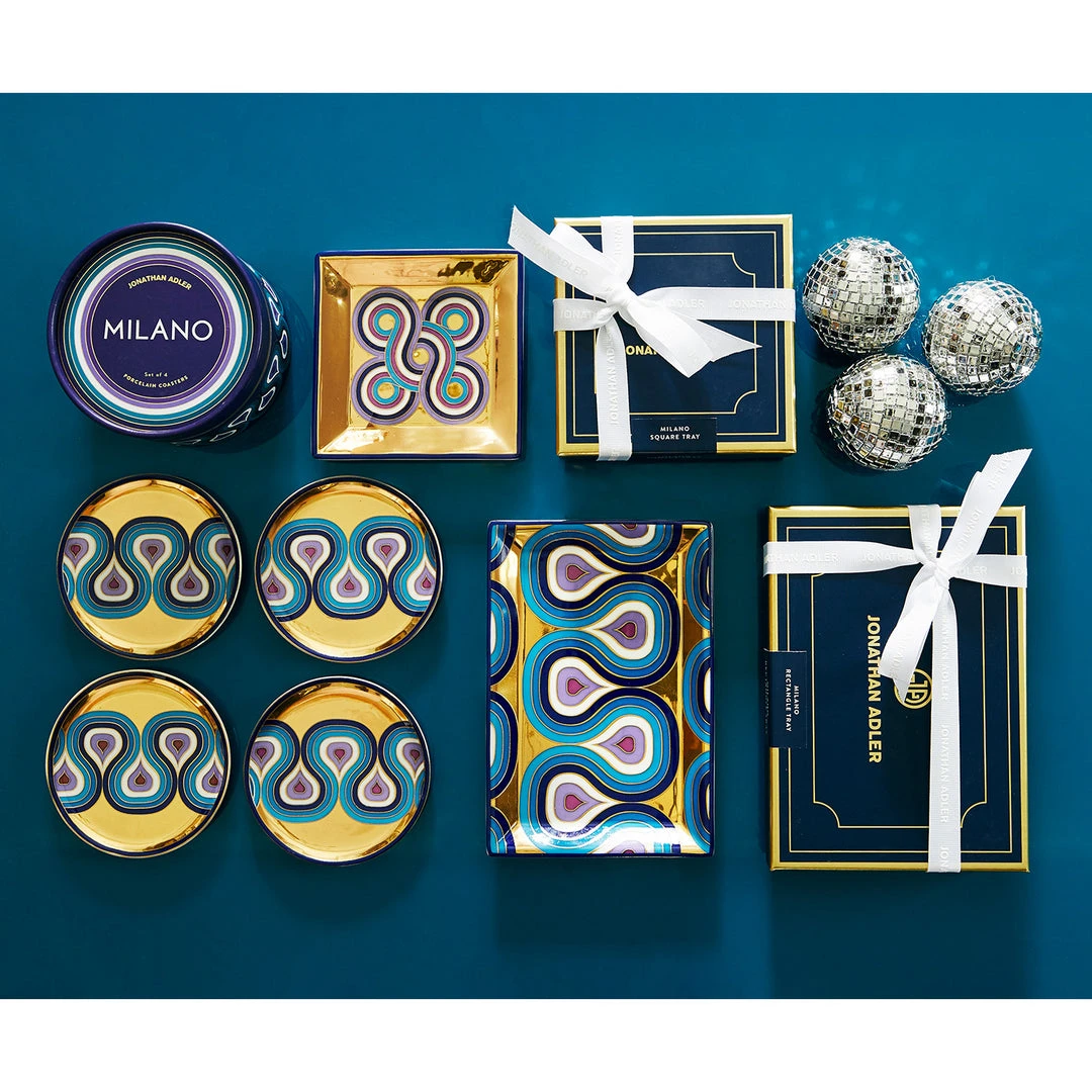 Mod patterns, heavenly hues. Treat your tablescape to our Milano trays, featuring concentric loops in cool blues and lavender on a warm gold backdrop. Crafted from high-fired porcelain.