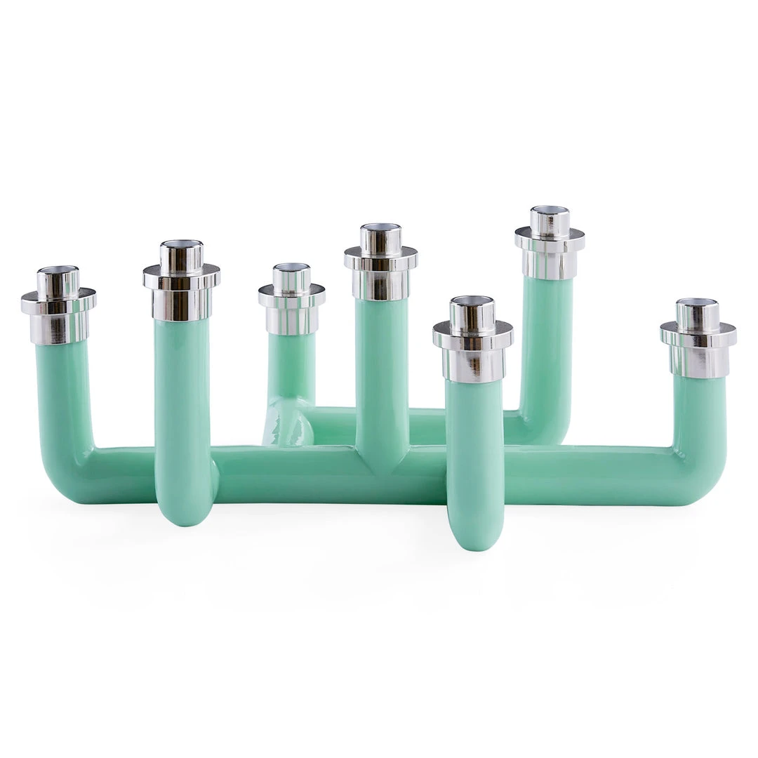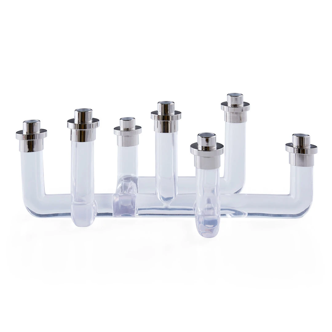70s inspired patterns meet daring dimension. Our Pompidou Candelabra features solid acrylic pipes of staggered heights fused together and accented with shiny nickel caps. The mood-setting centerpiece your modernist table needs. In luxe clear or posh celadon acrylic.