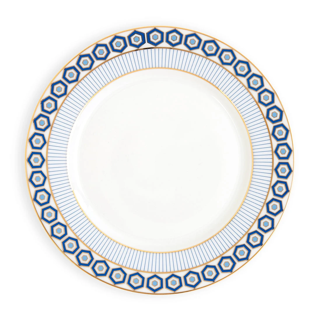 Our signature hexagon pattern in shades of blue with gold accents on generous porcelain dinnerware. Formal, but fresh. Perfect for everyday, but polished enough to impress your snootiest dinner party guest. Glamorous, glamorous, glamorous!