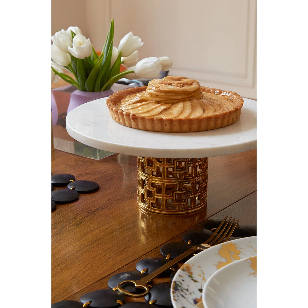 Our classic Nixon pattern adds a touch of trad to your tabletop. The Nixon Cake Stand elevates any dessert. A slab of Carrara marble rests atop a polished brass base with our signature pattern. Give desserts a place of honor or take hors d’ouerves to new heights.