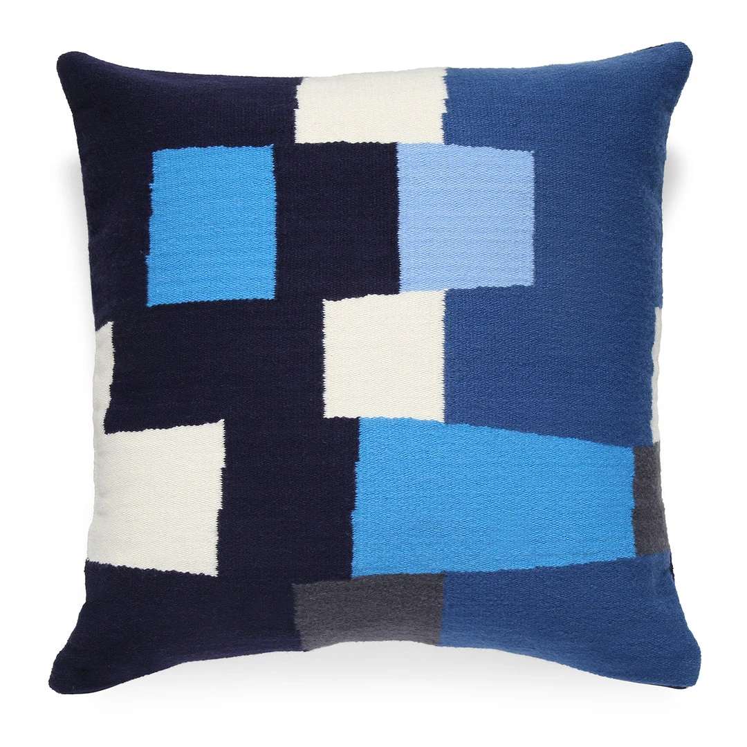 Layered shapes with rugged Brutalist-inspired lines in crisp shades of blue. Our Rio pillows feature asymmetrical designs front and back—any way you flip it, graphic greatness. Hand-woven by artisan weavers in Peru, our cool cushions are crafted from super soft and durable wool.