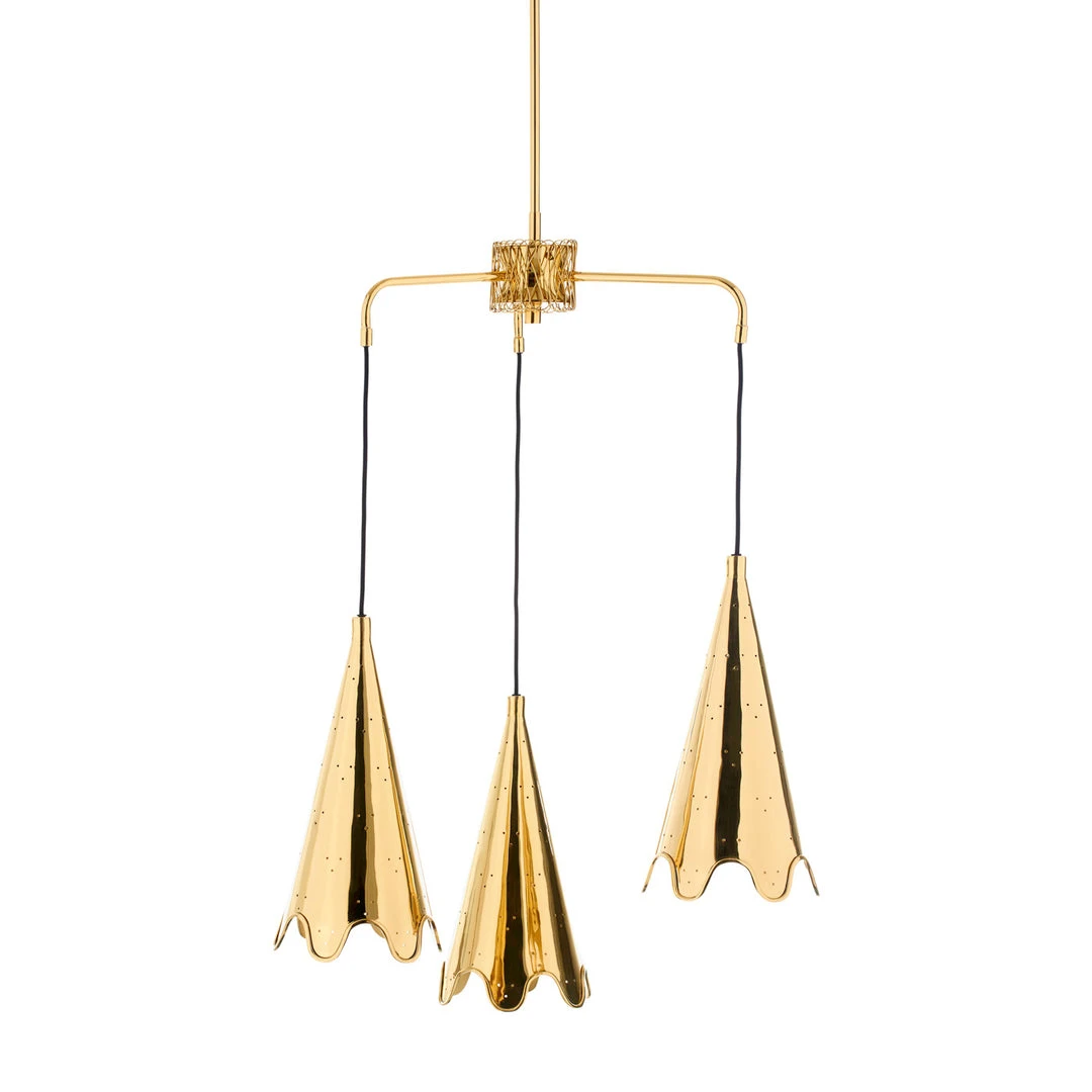Timelessly simple and unimpeachably luxe, our Ripple Multi Pendant Chandelier features three brass cones finished in our signature ruffled edge. All over patterns of perforation emit dots of light, while their luminous metallic finish naturally boosts each bulb’s glow. Moody glamour for a decadent entryway or dining room.