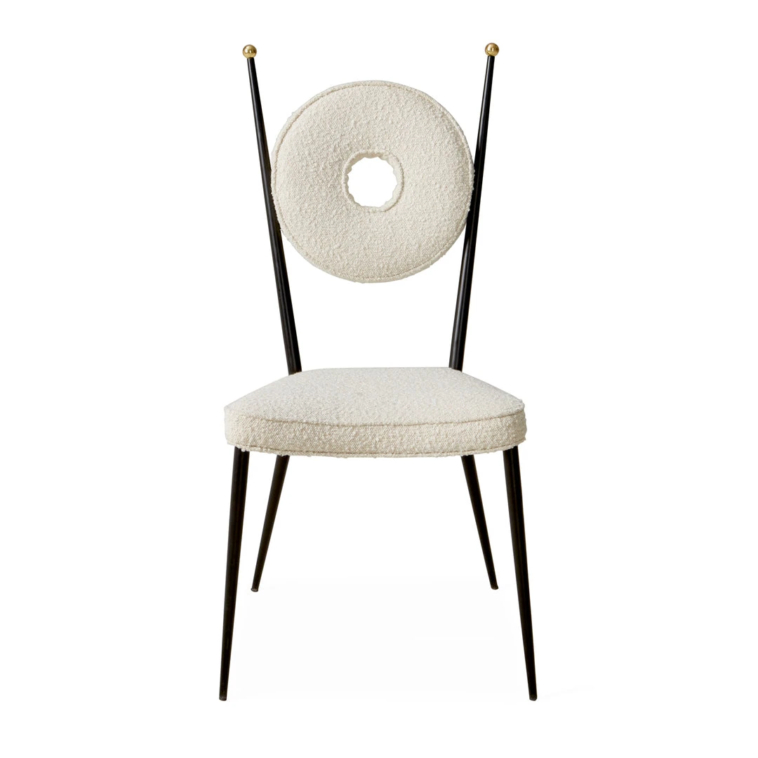 Featuring a blackened steel frame holding a chic donut back cushion suspended, our Rondo Chair is a looker. Topped with polished brass spheres for an extra glint of glamour and fitted with a shapely seat cushion, Rondo’s warm oatmeal bouclé is a comfy finish. Perfect for pairing up to flank a console, or let one steal the scene as a standalone statement.
