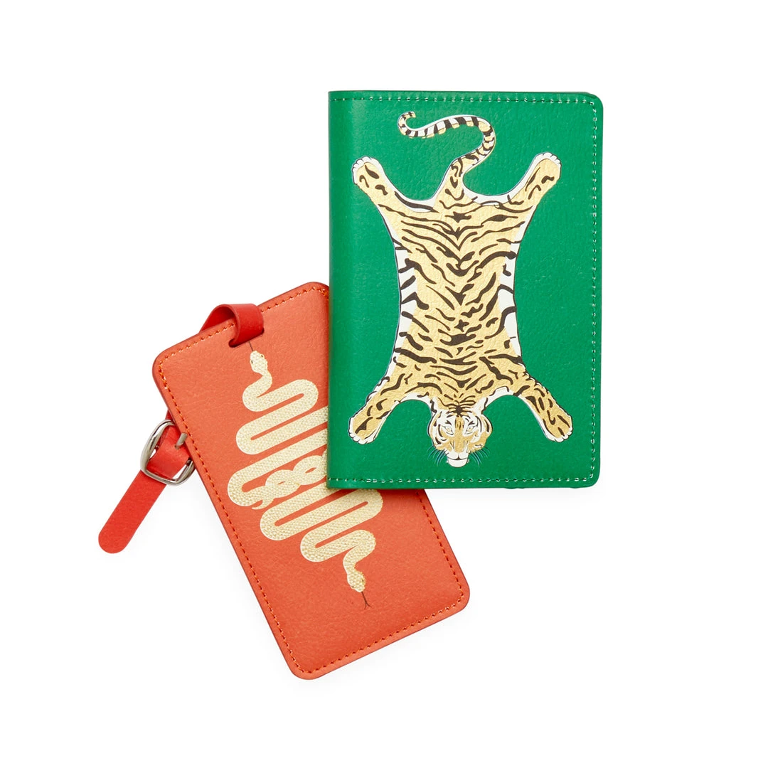 Always arrive in style. Our coordinating Safari passport cover and luggage tag pair a dangerously divine feline with slithering serpents, each embellished with gold foil accents on luxe vegan leather.