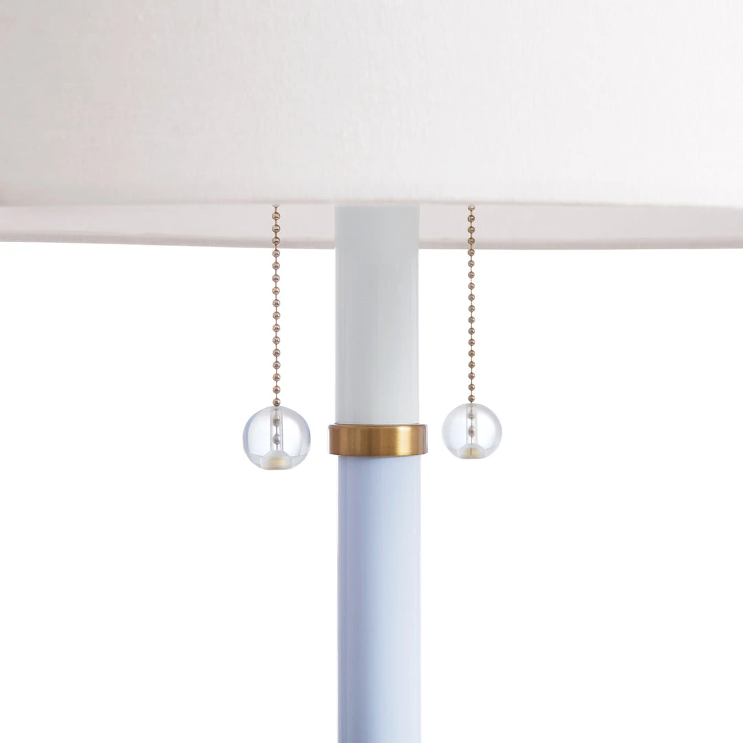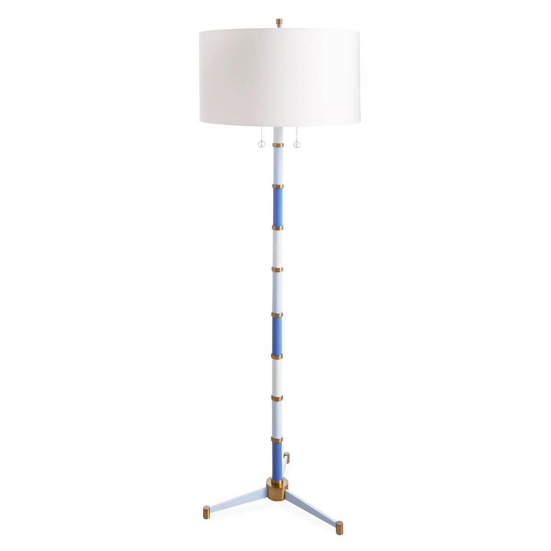Our twist on the traditional, iconic world of bamboo takes a mid-century silhouette and treats it to a mod motif—poppy blue hues segmented by brass accents. The perfect reading light next to a sofa or chair.