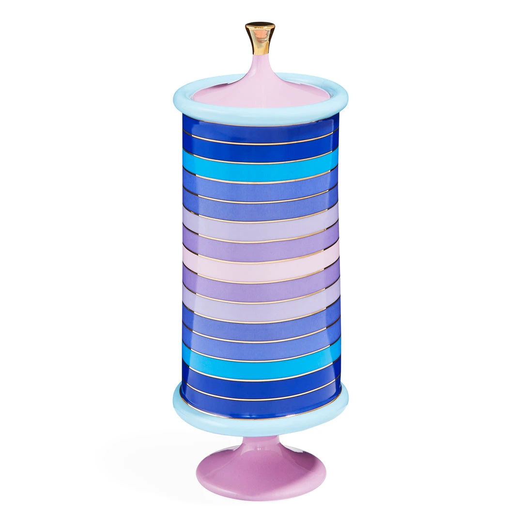 Featuring 60s inspired geometric stripes in cool blues and shades of lavender, our Scala Canisters are crafted from haute couture porcelain accented with real sparkly gold. A chic, chromatic spot to stash your secrets. Style them together on your console, mantel, or counter.