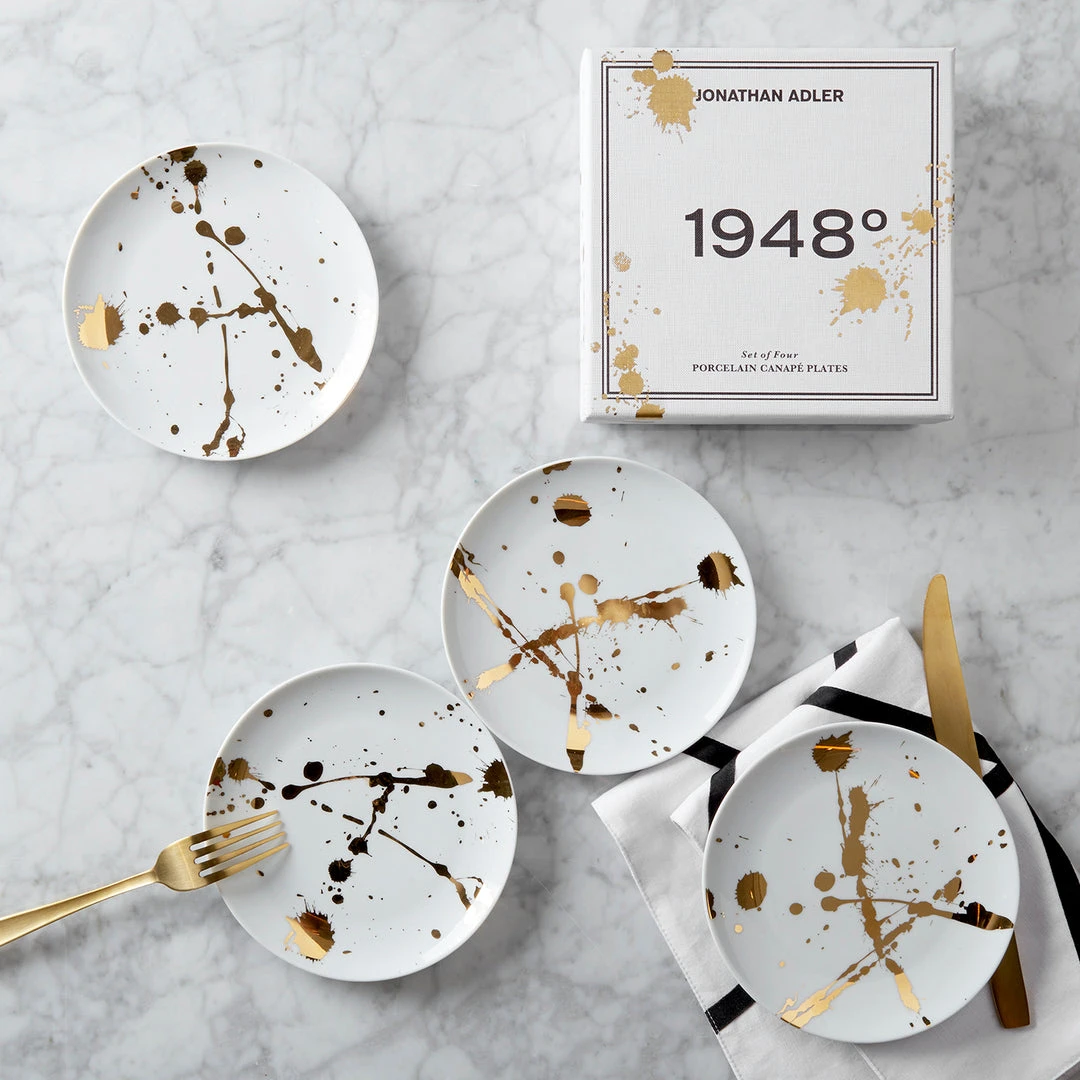 Named for the temperature at which gold melts, our 1948 collection features classic porcelain dinner and serveware splattered with real gold: the perfect balance of timeless and today, formal and fresh, uptown and downtown. Gilded and giftable in luxe packaging, our 1948 Canapé Plate Set is perfect for parties, desserts, or diminutive snacks. Formal enough for a fabulous fête, but hardworking for use as an everyday luxury.