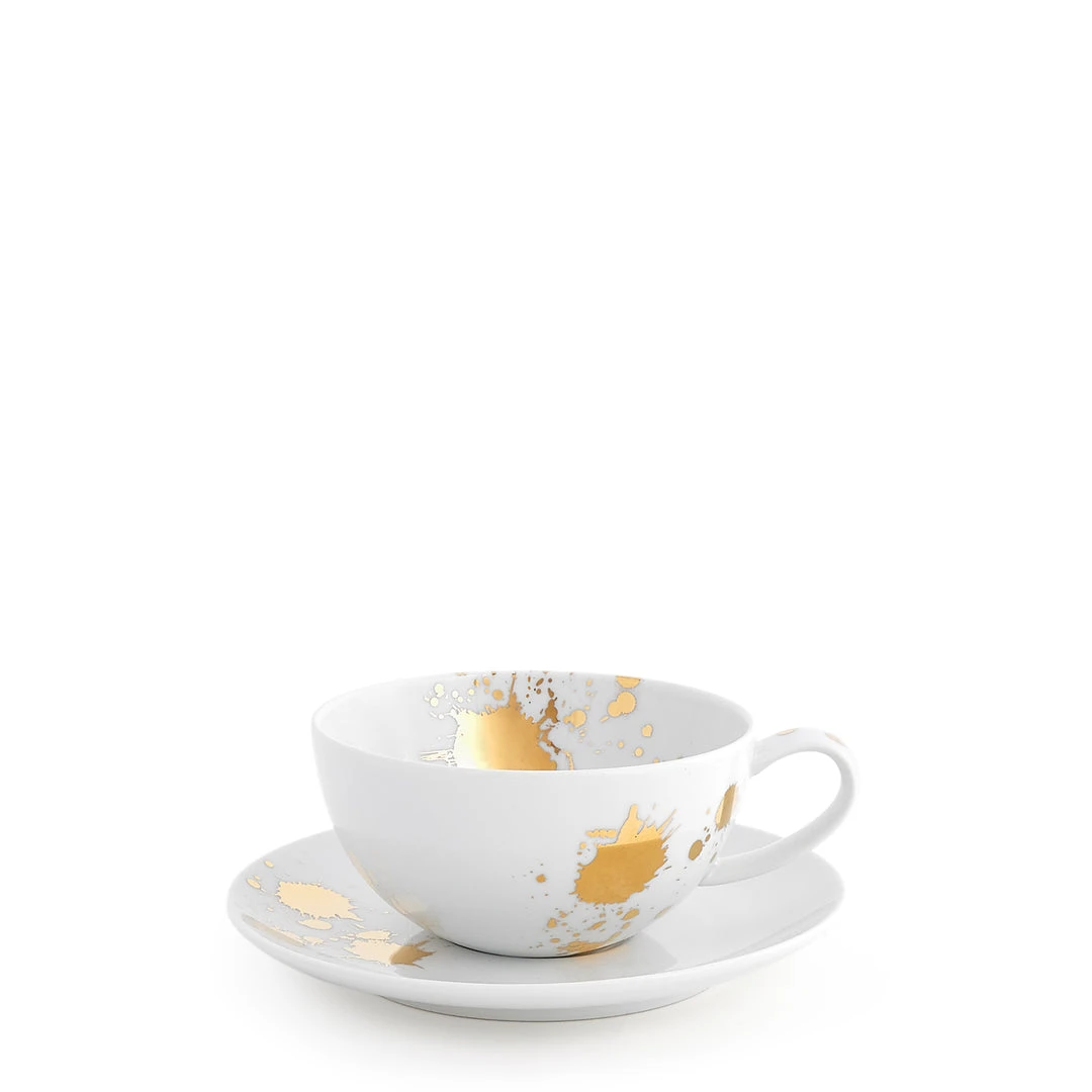 Chic and classique porcelain dinnerware in a generous scale and friendly coupe shape with a surprising splatter of solid gold. With its all-over splatter pattern, the dinner plate is like a sparkly neutral while the other pieces are embellished with a bold composition.