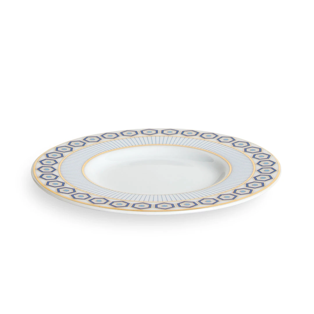 Our signature hexagon pattern in shades of blue with gold accents on generous porcelain dinnerware. Formal, but fresh. Perfect for everyday, but polished enough to impress your snootiest dinner party guest. Glamorous, glamorous, glamorous!