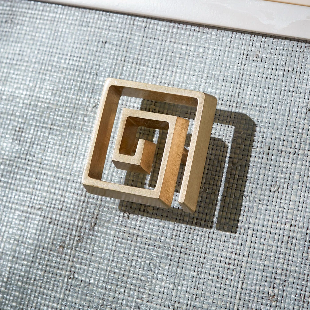 A discreet and glamorous workspace with Regency-inspired details and polished brass sabots. A stylish small space solution featuring a solid mahogany cabinet coated in ivory lacquer and faced with layers of natural raffia stained in an icy sky blue lacquer. The cabinet opens to become a desk featuring an ivory-lacquered mahogany interior with two raffia-faced drawers, four organizational cubbies, and a cord cut-out in the back. Brass sabots and Greek key hardware crank it up to 11.