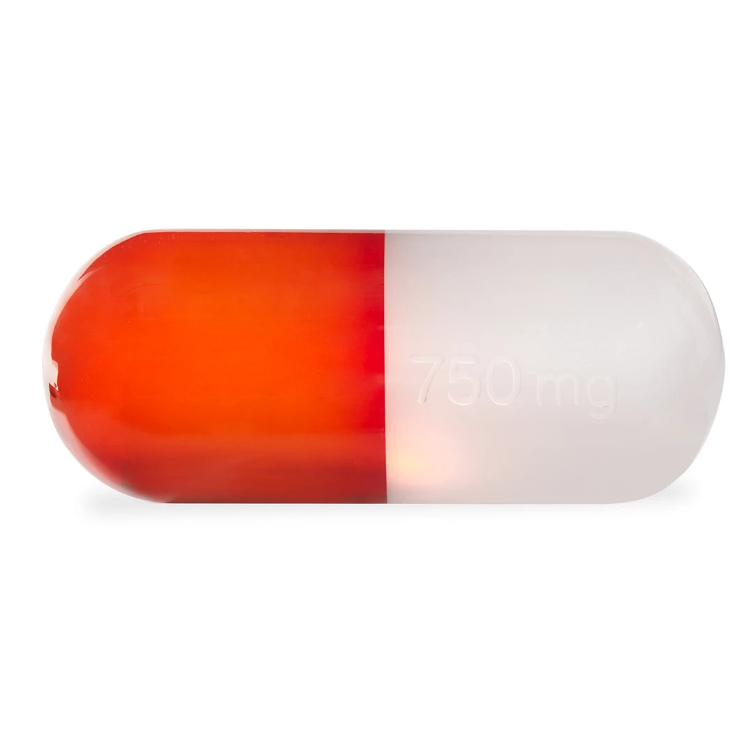 Get your daily prescription of surrealism with our lustrous homages to fab pharmaceuticals. Crafted from solid acrylic in a range of poppy colors with laser-etched dosages (small: 150 mg, medium: 300 mg, large: 500 mg, extra large: 750 mg) and six different, non-generic color combos. Use one as a paperweight—or why not get all six to create an art installation on your cocktail table?