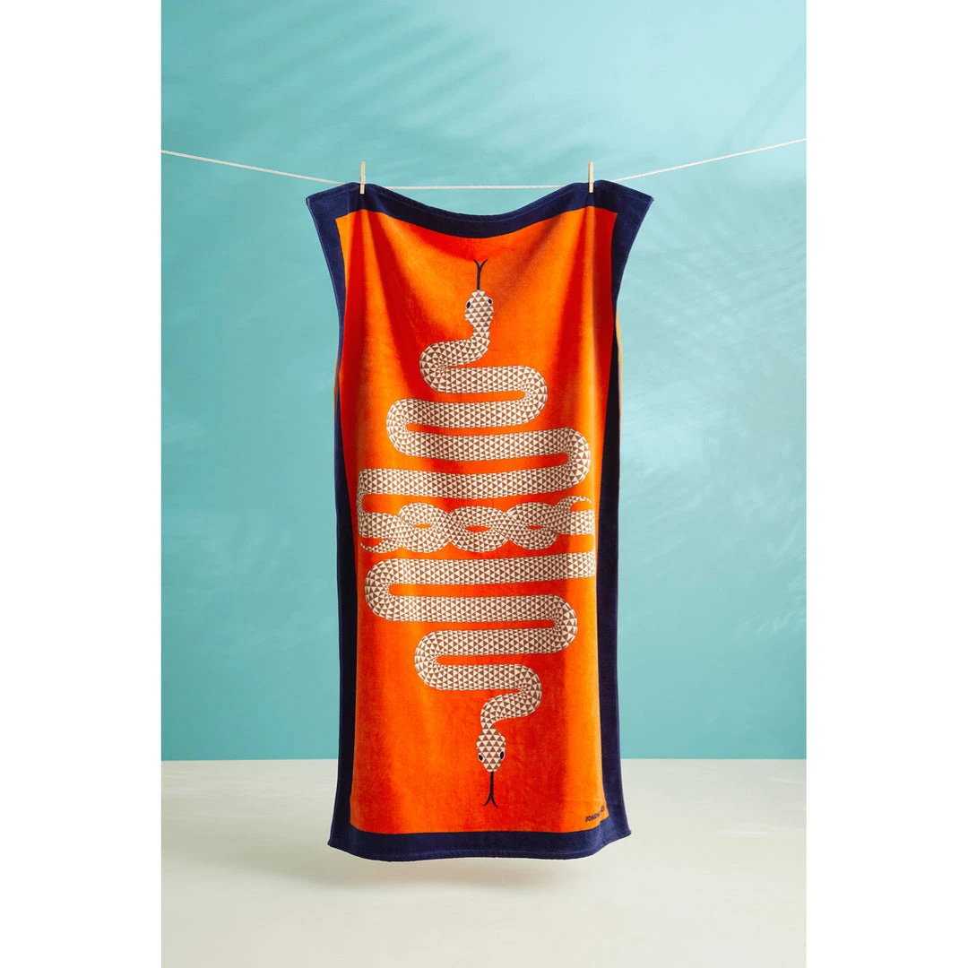 Channel the spirit of resort glamour with our generously sized, thick and thirsty beach towels. Ooze beach chic with a shimmering pair of gold serpents on bright poppy orange. White sand beach to infinity pool, they look as good draped across a chaise lounge as they do wrapped around your shoulders.