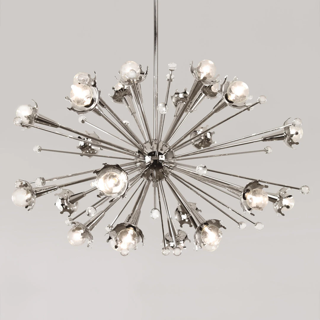 A groovy classic with our own twinkly twist. The Sputnik Chandelier is perfect for making your pad feel like a Parisian parlour. Our riff on the design staple features custom laser-cut crown cups that halo the bulbs for a modern glow. Tiny stems with crystal accents further reflect the galactic light and lend a ladylike grace to any room.