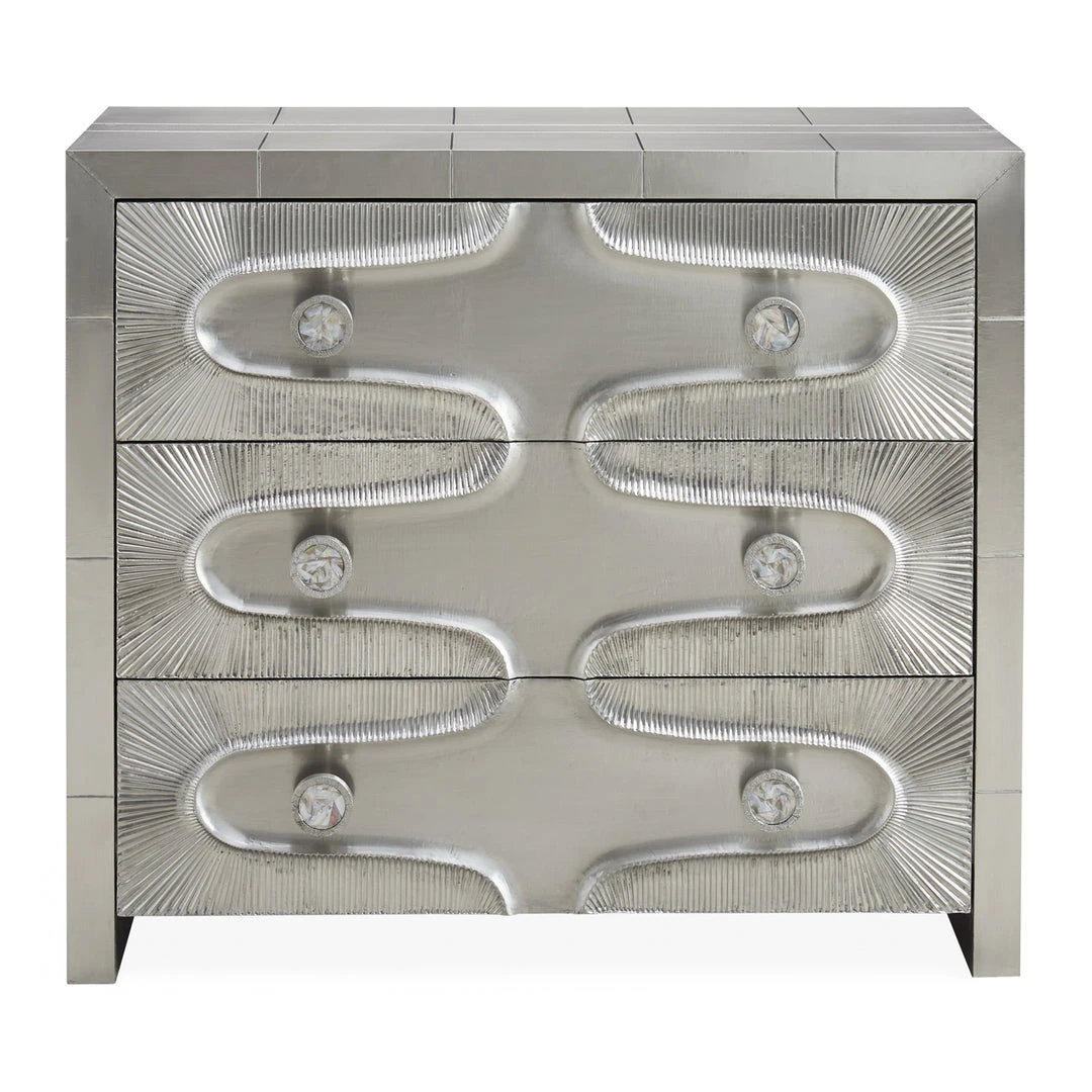 A glam companion in the boudoir, our Talitha Three-Drawer Chest is crafted from nickel-plated metal with hand-stamped patterns applied to a minimalist form. The surface is reminiscent of silver leaf—it emits that same lustrous glow—but is wonderfully durable. Featuring deep, self-close drawers with jewel-like hand-cut abalone inlaid pulls (due to the use of natural materials, colors will vary). Let our signature looping pattern shine in a glamorous lair or read more rock ‘n’ roll in a more minimalist space.