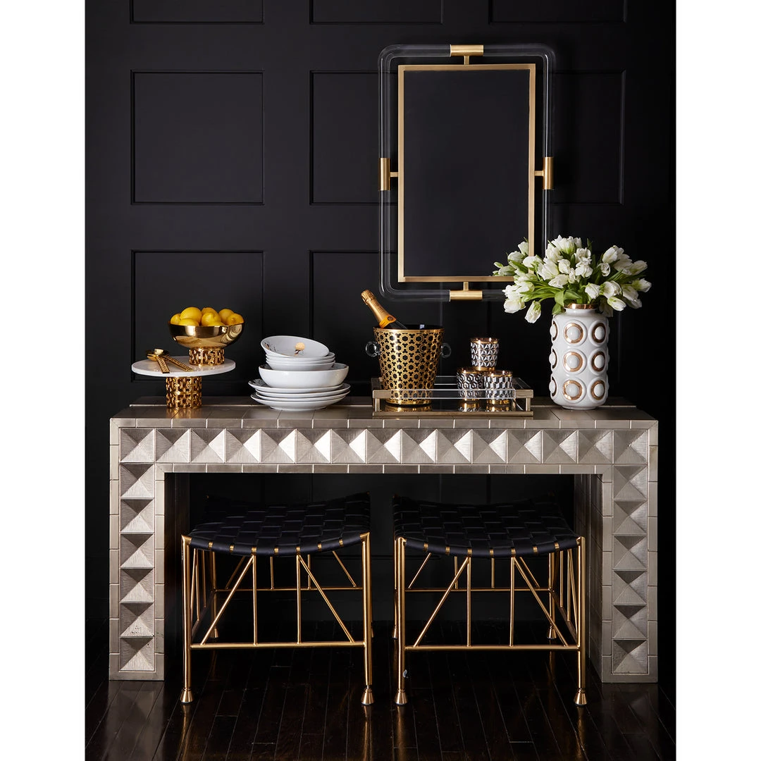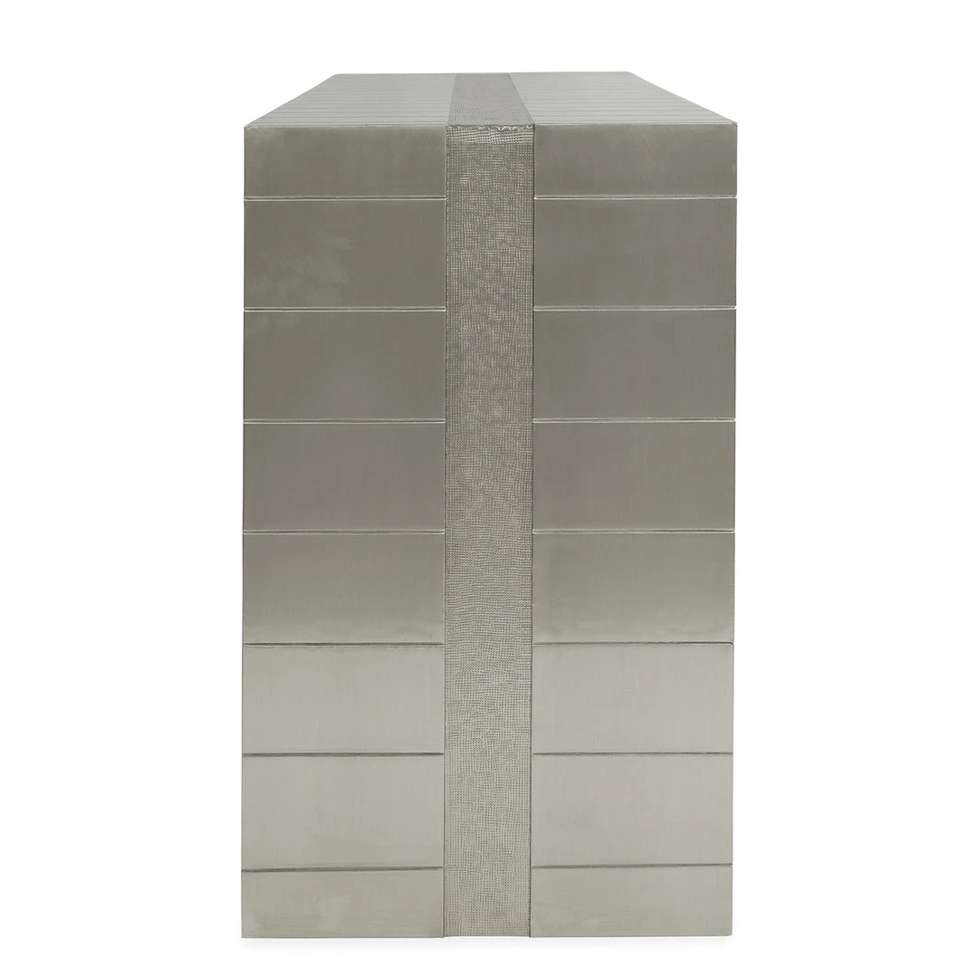 Our Talitha collection is crafted from nickel-plated metal with hand-stamped patterns applied to minimalist, modernist forms. Our waterfall console’s surface is reminiscent of silver leaf—it emits that same lustrous glow—but is wonderfully durable. Perfect for adding a regal, rich hippie vibe to your Park Avenue penthouse entryway or a bit of twinkly glamour behind a sofa in your downtown loft.